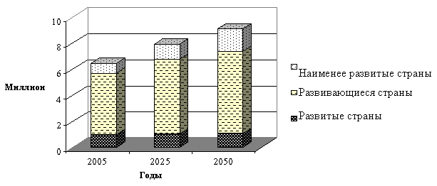 Рис 1. Численность населения в 2005 г. и по прогнозу на 2025 и 2050 годы Несмотря на некоторые меры по контролю над ростом населения, предпринимаемые некоторыми развивающимися и наименее развитыми странами, которые могли бы сдержать и возможно стабилизировать численность населения, допустим, к 2050 году, предполагаемые потребности растущего населения порядка 8 миллиардов человек должны быть тщательно спланированы. В отношении развивающихся и наименее развитых стран, там, где будет иметь место рост населения, страны столкнуться с необходимостью увеличить продовольственное снабжение за счет роста производства на своей собственной территории, может быть в сочетании с увеличением импорта. Для развивающихся стран есть дополнительная сложность в том, что быстро повышающийся уровень жизни в результате приводит к увеличению потребления на душу населения и изменениям в рационе питания. С точки зрения производства продуктов питания есть общее ощущение, что в ближайшие десятилетия приблизительно 80-90% требуемого увеличения должно быть реализовано на существующей культивируемой земле и около 10-20 % - на недавно восстановленных землях. С точки зрения устойчивого развития сельских районов, социально-экономические и экологические аспекты играют решающую роль. Если мы посмотрим на производство зерновых культур в трех типах стран, а также на различных континентах, то можно сделать следующие общие выводы (Приложение 1). Развитые страны имеют превышение экспорта над импортом приблизительно 10% от своего производства. Развивающиеся страны имеют чистый импорт, но он весьма низок, если мы выражаем его в дефиците на душу населения, но выглядит это так, что в целом они в состоянии обеспечить себя продуктами питания. Поразительно то, что наименее развитые страны имеют превышение импорта над экспортом по зерновым культурам 30% от своего собственного производства. Учитывая, что при отсутствии средств управления водными ресурсами, эти цифры могут изменяться в связи с изменениями атмосферных осадков, планирование мировых требований должно быть сделано на основе явно намечаемых в будущем тенденций. Решения для таких тенденций, которые являются временными в связи с климатическими условиями, лучше всего обеспечиваются путем интервенций, которые могут оградить от влияния изменчивости климата. Что касается тенденции уменьшения инвестиций в сектор, по крайней мере, от международных доноров за последние десятилетия, то необходим критический пересмотр. Вопрос состоит в том, что если проводить консультации с местными органами власти, можно ли изменить эту тенденцию? Необходимо ли это, и если так, то какие должны быть приоритеты? Выводы Считается важным инициировать обсуждение по поводу этой проблемы, повысить понимание и во время следующего Всемирного Водного Форума в Стамбуле (ВВФ5) представить и обсудить приоритеты для действий. Важными моментами являются: