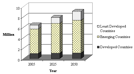 Figure 1. Population in 2005 and prognoses for 2025 and 2050 (Schultz, et al., 2005) Notwithstanding some measures for the control of the population growth undertaken by some of the emerging and least developed countries which could retard and perhaps stabilise the population say by 2050, the projected needs for an increased population of about 8 billion people are to be properly planned. In respect of the emerging and least developed countries where the population growth will take place, these countries will be confronted with the need to increase their food supply by a larger production in their own territory, may be in combination with increased imports. For the emerging countries there is the additional complication that the standard of living is rapidly rising resulting in an increase in consumption per person and a change in diet. From the point of view of food production there is a common feeling that in the coming decades about 80 - 90% of the required increase will have to be realised on existing cultivated land and about 10 - 20% on newly reclaimed land. From the point of view of sustainable rural development, socio economic and environmental aspects play in particular, crucial rolesþ If we look at the production of cereals in the three types of countries, as well as in the different Continents, then the following general conclusions can be drawn (Annex 1). The developed countries have an export surplus of about 10% of their production. The emerging countries have a net import, but this is quite low if we express it in deficit per person and it looks like they are overall able to be food self sufficient. Striking is that the least developed countries have an import surplus in cereals of 30% of their own production. Granting that, in the absence of water management facilities, these figures could vary due to the linkages with the variations in precipitation, planning for the global requirements would have to be on a robust basis of projected trends. The solutions for such tendencies, that are temporal with linkages with climate, are best solved by interventions, which can insulate the impact of variations in climate. With respect to this the declining trend in investments in the sector - at least from international donors - during the last decade needs a critical review. The question is if in consultation with the local governments, could this trend be reversed? Is it needed and if so which may be the priorities? Conclusions It is considered to be of importance that the debate with respect to this issue will be triggered, that awareness is raised and that priorities for action be presented and discussed during the next World Water Forum in Istanbul (WWF5). Crucial points are:
