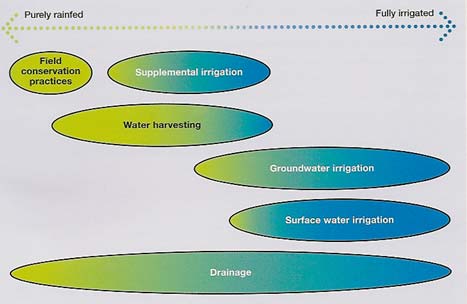 It looks like the main source of water efficiency increases lies in the improvements in small-scale agriculture (low yields). Better agricultural water management to improve the yields of that agriculture is the key, keeping in mind that water is not the only production factor, others being land, fertilisers, reduction of post harvest losses, looking after virtual water conservation and storage, etc. In the future, the needs are huge to feed the world population due to an expected increase by 50 - 100% by 2050. This increase is especially expected in the emerging and least developed countries. Considering the need to feed the 850 millions under-nourished, the likely diet changes and the population increase, the food production would roughly have to be doubled within 50 years. Which means a range of water for food between 10,000 and 14,000 billion m3. This depends to a large extent of the capacity of small-scale agriculture to increase its productivity (yields and water productivity) and the required expansion of irrigated agriculture. Out of the increase of 3,000 to 7,000 km3, in the rainfed areas without a water management system, water harvesting and watershed management may result in some improvements, especially in the livelihood of poor farm families. There is, however, no way that the cultivated area without a water management system can contribute significantly to the required increase in food production (with the additional threat posed due to Global Climate Change). Due to this the share of irrigated and drained areas in food production will have to increase. This can be either achieved by installing irrigation, or drainage systems in the areas without a system, improvement, or modernisation of existing irrigation and drainage systems, installation of irrigation systems in the rainfed drained areas, or installation of drainage systems in irrigated areas. There is thus a need to consider a series of water management solutions from purely rainfed to large-scale irrigated areas (Figure 2).