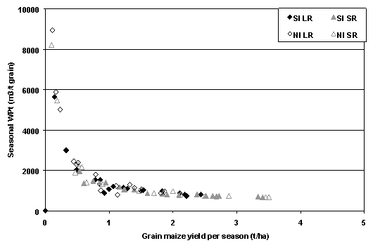 Figure I.3. Relation between yield and water use in m3 per ton of grain for maize. |