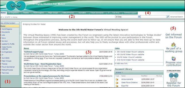 1. Introduction 1.1. What is the Virtual Meeting Space? The 5th World Water Forum’s Virtual Meeting Space (VMS) is an interactive password-protected portal, using Microsoft SharePoint technology, which will virtually bring together those interested in identifying solutions to the most crucial water-related issues in the world today. It will be a central place for the preparation of the 5th World Water Forum’s thematic, regional, political and major group processes, as well as the sessions and many other components. By facilitating the contribution to the Forum of thousands of individuals and organizations, through a participatory and consultative approach, it will enhance the communication, exchange, networking and collaboration within the water community as well as allowing water experts to discuss with professionals from other disciplines. This user guide will explain how you can use the VMS to make a difference to the 5th World Water Forum. 1.2. How do I log onto the VMS? The VMS is accessible through http://portal.worldwaterforum5.org, through any web browser and from any computer, although it is designed to optimally interact with Microsoft Internet Explorer. Entering the user name and password that have been sent to you will take you to the VMS home page (see figure 1). Please note that both your username and password are case-sensitive. When you first log into the VMS, we recommend that you personalize your password by clicking on “Welcome (your name)”, in the menu at the very top of the screen, then selecting “Change Password”. If you have any problem with or have forgotten your password, please click on “Forgot your password” from the login page. 1.3. What will I see when I first log on? The VMS home page (see figure 1) is the starting point for your participation in the Forum. From the left-hand menu of the page (1) you can access the various workspaces. The same options are repeated for your convenience in the top menu bar (2), and remain visible throughout the VMS. In the centre of the home page (3), you can view the latest general news related to the Forum, the Forum Document Library, some useful web links and the Water Events Calendar. On the top-right corner of the page (4), you can search the VMS for useful information and look for other users. Finally, on the right-hand side of the home page (5), you will find the four main means of organizing your participation in the Forum, described below. Figure 1. The VMS home page The four main means of organizing your participation (5) in the 5th World Water Forum are the following: