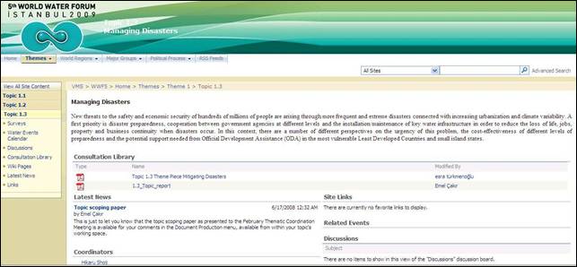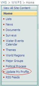 Please note that the registration site is managed by the 5th World Water Forum’s Professional Conference Organizers (PCO), Perl PCO, who will be pleased to answer any questions you may have in order to facilitate your stay in Istanbul. It is worth mentioning that a number of discounts are being offered in the registration fees, including a 20% discount for all participants who register before December 31st, 2008, and further discounts for young people and participants from developing and the least developed countries. Each active member of the World Water Council will also receive a 20% discount for five of its representatives. For more information on the registration process, please visit the 5th World Water Forum website. 6. How can I use the VMS for networking opportunities? The first step to let other users know about you is to update your profile, by clicking on “Update My Profile” on the left-hand menu of the VMS home page (see figure 8). Once you have completed the profile form, you will be taken to “My Site”, your personal home page within the VMS that has shortcuts to all of your workgroups and other information that you are interested in, including your documents, links and colleagues. Each user that has clicked on his or her “My Profile” has a personal home page that you can search, to find individuals or organizations that are interested in and knowledgeable about similar activities. This function will eventually allow the VMS to become the “Who’s Who Of Water”, thus greatly enhancing the networking opportunities (and “bridging divides”) for the water sector. Figure 8. Update My Profile 7. What else can I do through the VMS? A large number of other functionalities have either already been developed or will be in the coming weeks and months. Just to cite a few examples: