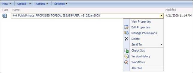 Please note that all work that goes on through the VMS should be in English, the official language of the Forum. 3.3 How can I contribute to the production of a document within a workspace? If you would like to make any changes to the document, you should first check it out by clicking on the down arrow next to that document (see figure 7) and selecting “check out”. Checking out a document blocks it so that no other user can modify the document at the same time, and therefore avoids the possibility of there being several different versions. Other users will still be able to view the saved version of the file, but will not be able to save any changes they might make until you check it back in. They will also be able to see who has checked it out. You should not keep a file checked out for more than a couple of days at most, to ensure that others can also contribute to the document. Figure 7. Document options Once your document is checked out, a diagonal arrow will appear in the bottom right-hand corner of the file icon. To then edit the document, you should do the following:
