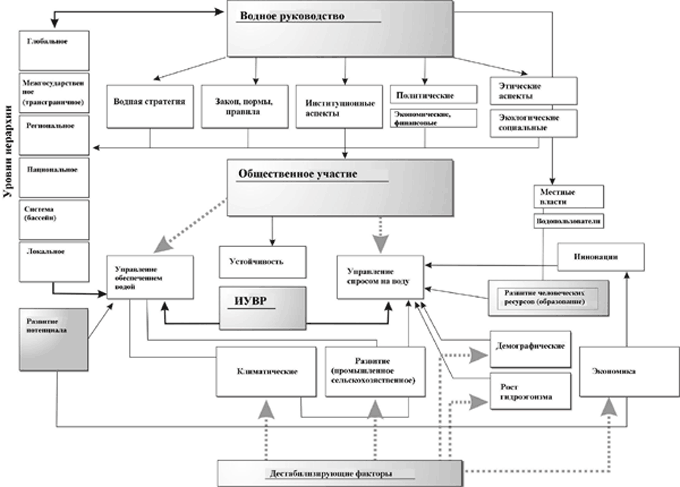 Усиление системы водного руководства означает выработку комплексных мер, которые охватывают правовые, институциональные, финансовые и социальные составляющие с целью увязки всех уровней водохозяйственной иерархии. Эти меры должны устранить большинство недостатков и уязвимость существующей системы водного руководства, а также возможность игнорирования интересов других водопользователей или создания неопределенности в их водопользовании независимо от уровня водохозяйственной иерархии. Подобное множество мер мы разделили на две части: усиление водного руководства на трансграничном уровне (международные водотоки) особенно важно и охватывает глобальный, трансграничный уровень и меры на национальном и локальном уровне. ИУВР (интегрированное управление водными ресурсами) как комбинация управления обеспечением водой и (УСВ) управления спросом на воду должно стать основой для поддержания и сохранения постоянного баланса между ними. ИУВР постоянно рассматривается в преодолении воздействия последствий дестабилизирующих факторов (рис.), таких как изменение климата, демографическая нагрузка, промышленный рост и потребность в выработке электроэнергии, рост понимания и спроса окружающей среды. Все эти факторы влияют на УОВ и УСВ, но система планирования, внедрения и обеспечения ИУВР позволяет справляться с этими рисками. Подобная интеграция должна охватывать все виды взаимосвязанных пресноводных объектов, включая как поверхностные, так и подземные воды, и надлежащим образом учитывать аспекты качества и количества воды. Необходимо признать многоотраслевой характер освоения водных ресурсов в контексте социально-экономического развития, также как и множество интересов в использовании водных ресурсов, включая питьевое водоснабжение и санитарию, сельское хозяйство, промышленность, городское развитие, гидроэнергетику, рыболовство во внутренних водоемах, транспорт, рекреацию, управление низинами и равнинами и прочие виды деятельности. Схемы рационального использования воды по освоению поверхностных и подземных источников водоснабжения и других потенциальных источников должны сопровождаться мерами по водосбережению и минимизации ее потерь. Однако, приоритет должен быть отдан мерам по предотвращению и контролю паводков, а также контролю седиментации, там, где необходимо. Общественное участие (ОУ) – это очень важный аспект водного руководства, который должен быть четко обозначен в национальном водном законодательстве, трансграничных соглашениях и всех местных требованиях, нормах и правилах. ОУ создает исходную базу ИУВР, а участие организаций заинтересованных в управлении водоснабжением в форме Советов ВХО, Советов ирригационной системы и Ассоциаций водопользователей (АВП) в сочетании с гидрографической системой управления водоснабжением будет гарантией против административного и профессионального гидроэгоизма, а также коррупции. Финансовые инструменты в виде подготовленных соглашений и договорных обязательств между ВХО и АВП будут способствовать эффективности УСВ. ИУВР также сосредоточено на Трансграничных водных ресурсах, которые играют большую роль для бассейновых государств и их использовании. В этой связи, сотрудничество между этими государствами , желательно в соответствии с существующ