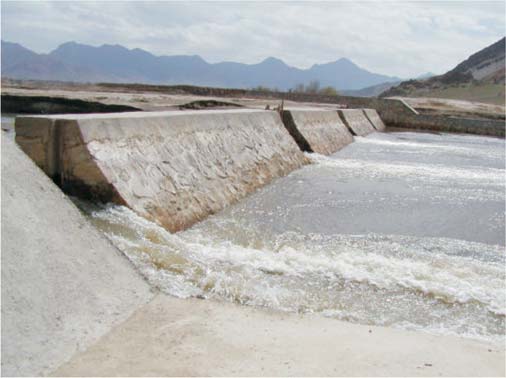 About 85 per cent of all crops in Afghanistan are grown under irrigation. Canal irrigation is by far the most commonly used method of irrigation in Afghanistan. Canals in Afghanistan irrigate nearly 75% or 1.9 million ha of land. As is evident from Figure, the proportion of canal-irrigated land is much greater than any other form of irrigation. Most of the canal-irrigated land is located in the north, west, and southwest of the country. These canals primarily get water from the snowmelt rivers in the region. At different locations along the river, small diversion structures are installed to divert water from river to the irrigation canals. These diversions are both open or gate fitted. Newly build Logar dam and a typical gate fitted diversion point is shown in Figures. From these canals, water is diverted to small irrigation channels (watercourses). According to the water laws of 1981, the amount of water given to each farmer is determined according to its area under cultivation, the kind of crop, the irrigation regime, the water rights document, the local practice and amount of water present in the main source. However, these regulations are not strictly followed and water distribution is mainly done on informal agreements among the farmers.