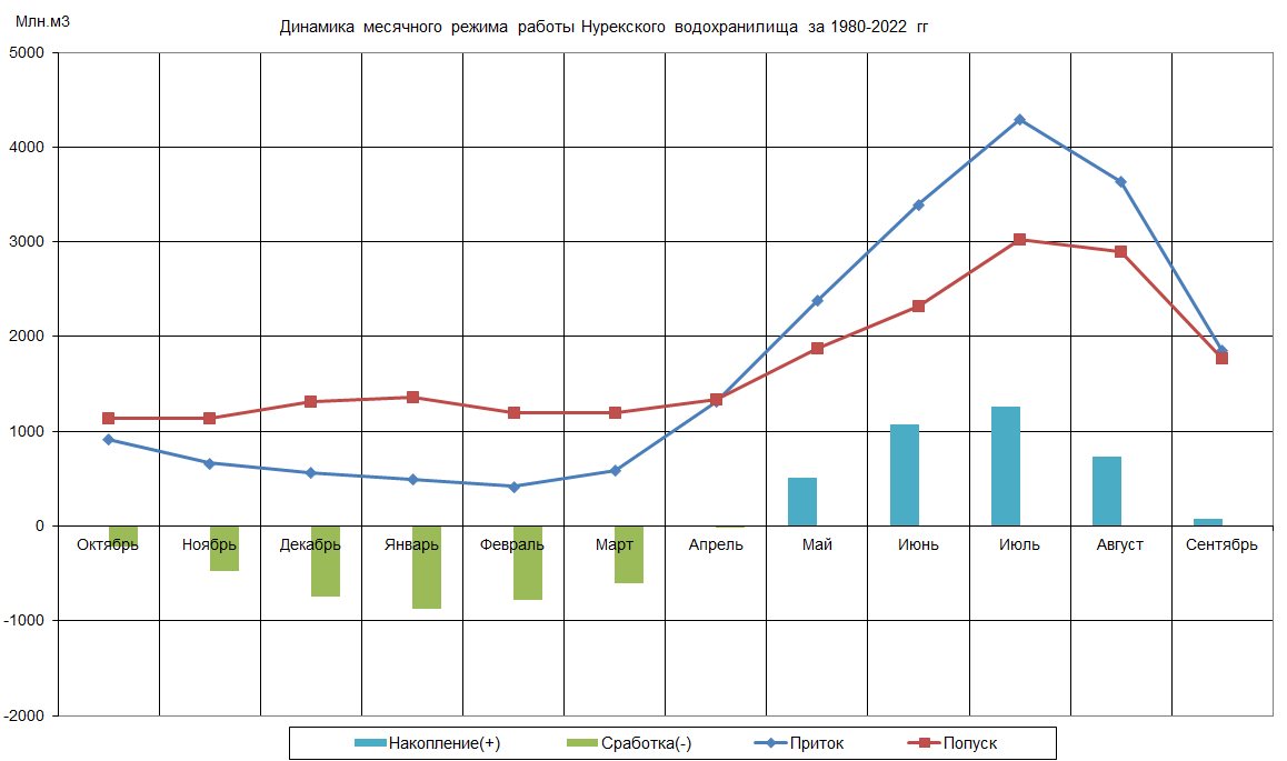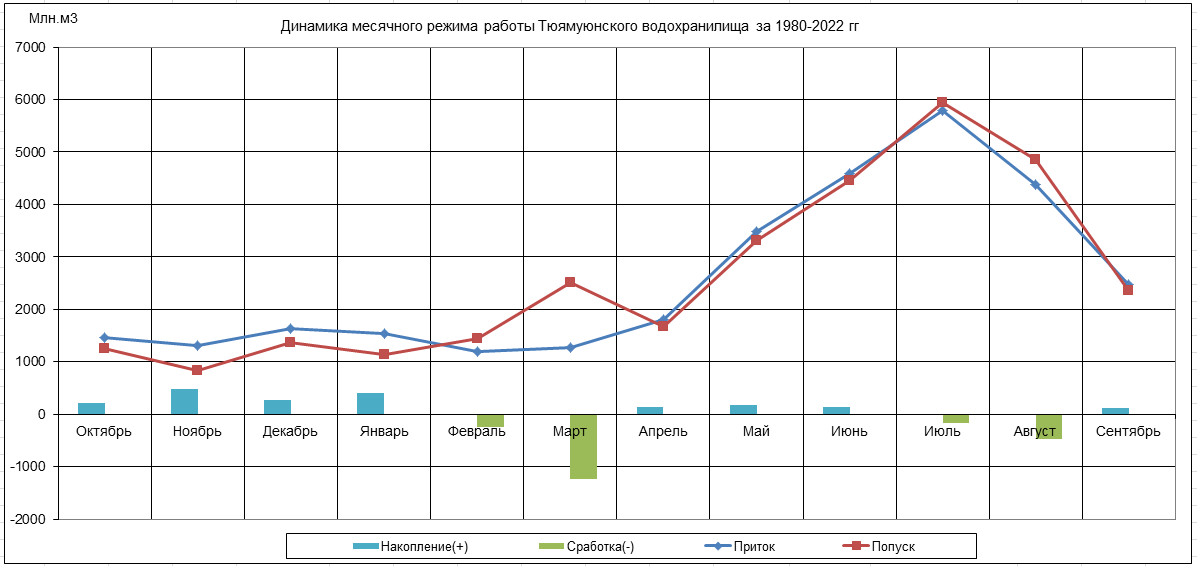 Динамика месячного режима работы водохранилища (1980-2022)