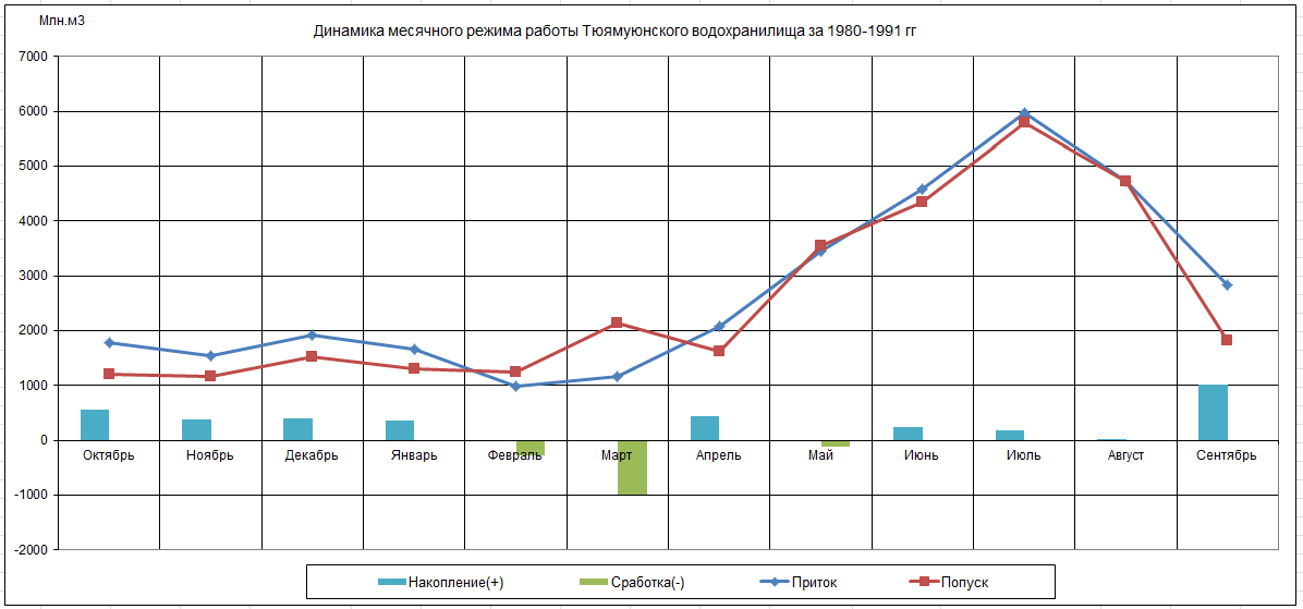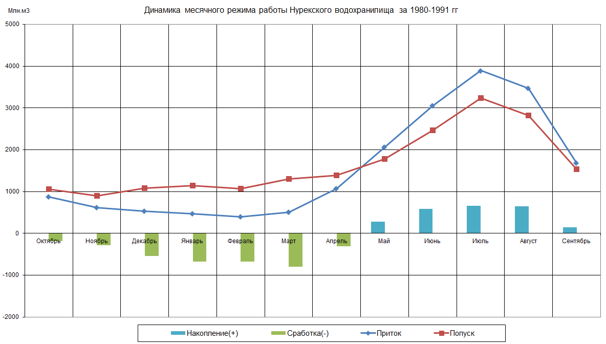 Динамика месячного режима работы водохранилища (1980-1991)