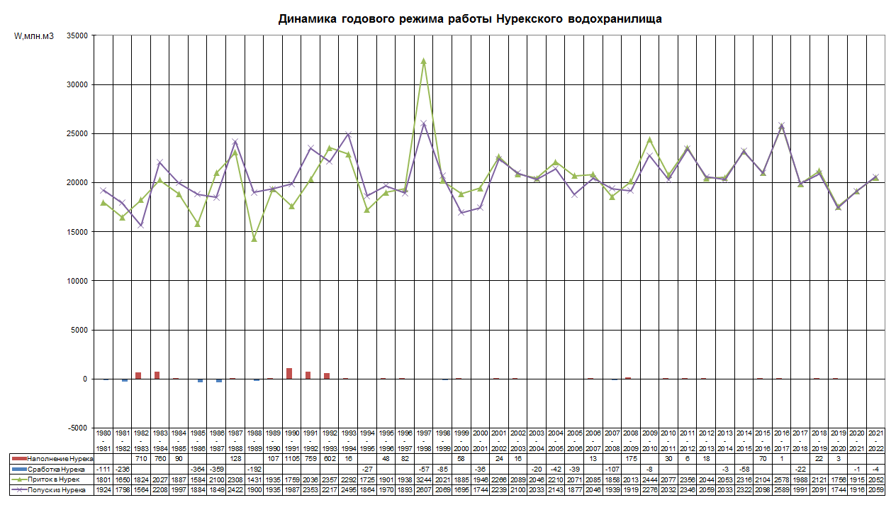 Динамика годового режима работы водохранилища (1980-2022)