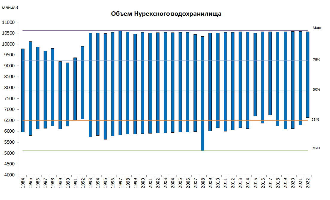 Основная схема режима регулирования стока р. Амударьи следующая. Нурекское водохранилище обеспечивает многолетний запас воды вплоть до створа Керки. Попуски воды зависят от изменений стока рек Пяндж, Кафирниган, Сурхандарья и Кундуз, а также от спроса на воду на площади ниже по течению от Керки. Туямуюнское водохранилище работает в сезонном режиме. Оно собирает сброшенную воду из Нурекского водохранилища и дополнительный сток Амударьи. Попуски из него обычно начинаются в феврале-марте.