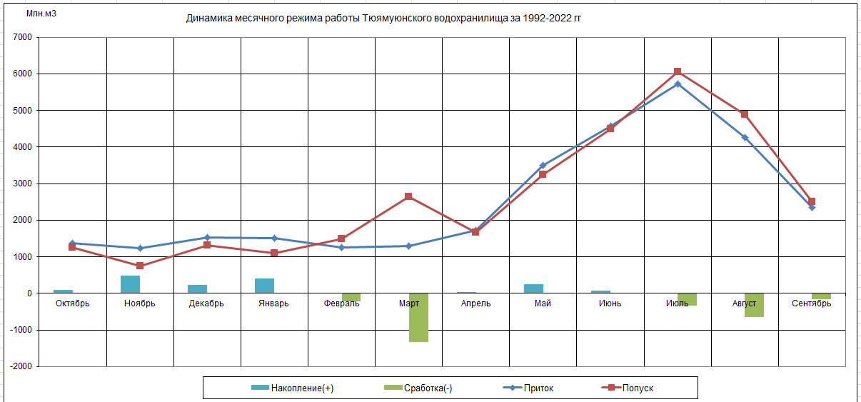 Динамика месячного режима работы водохранилища (1992-2022)