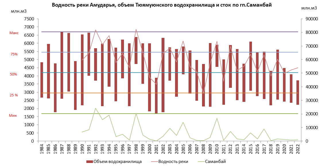 Водность реки Амударья, объем Тюямуюнского водохранилища и сток по г/п Саманбай (1984-2022)
