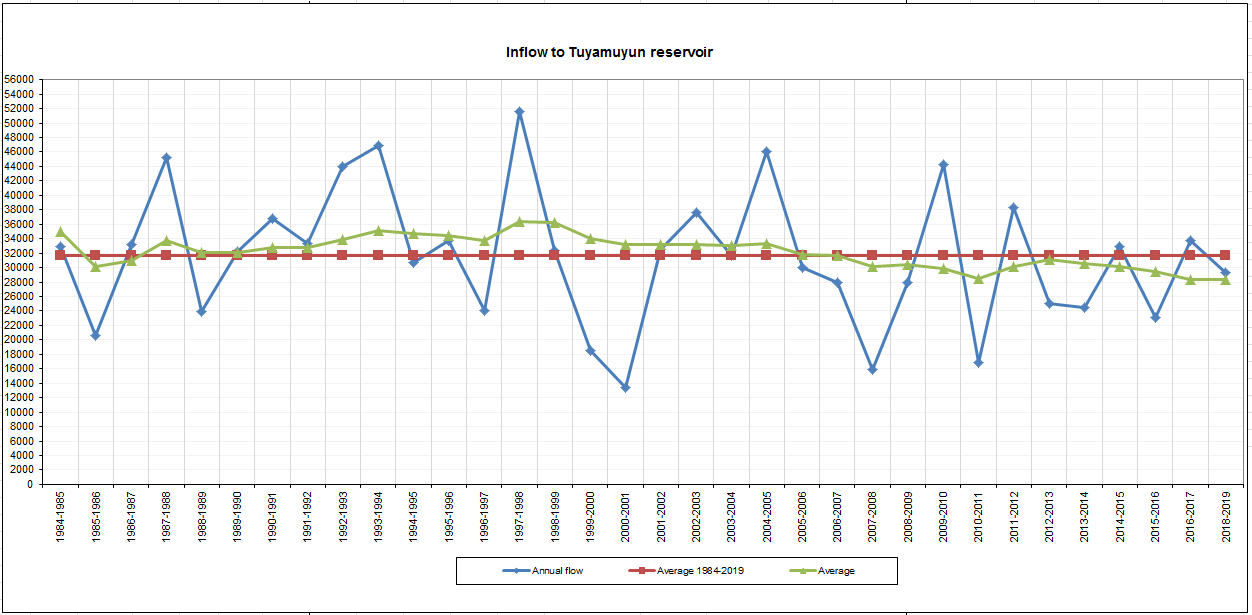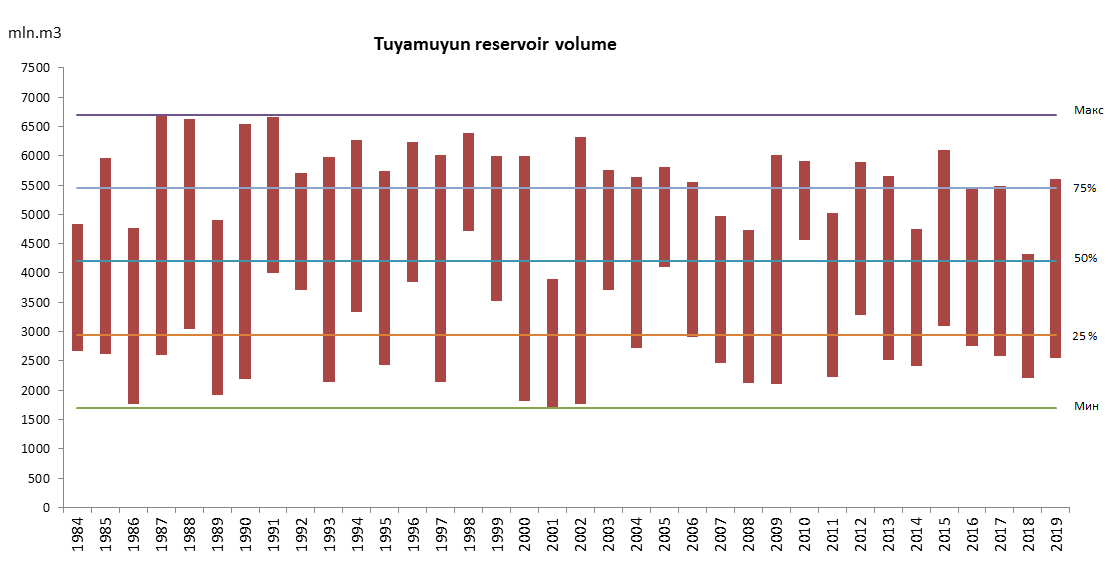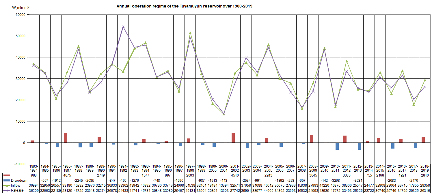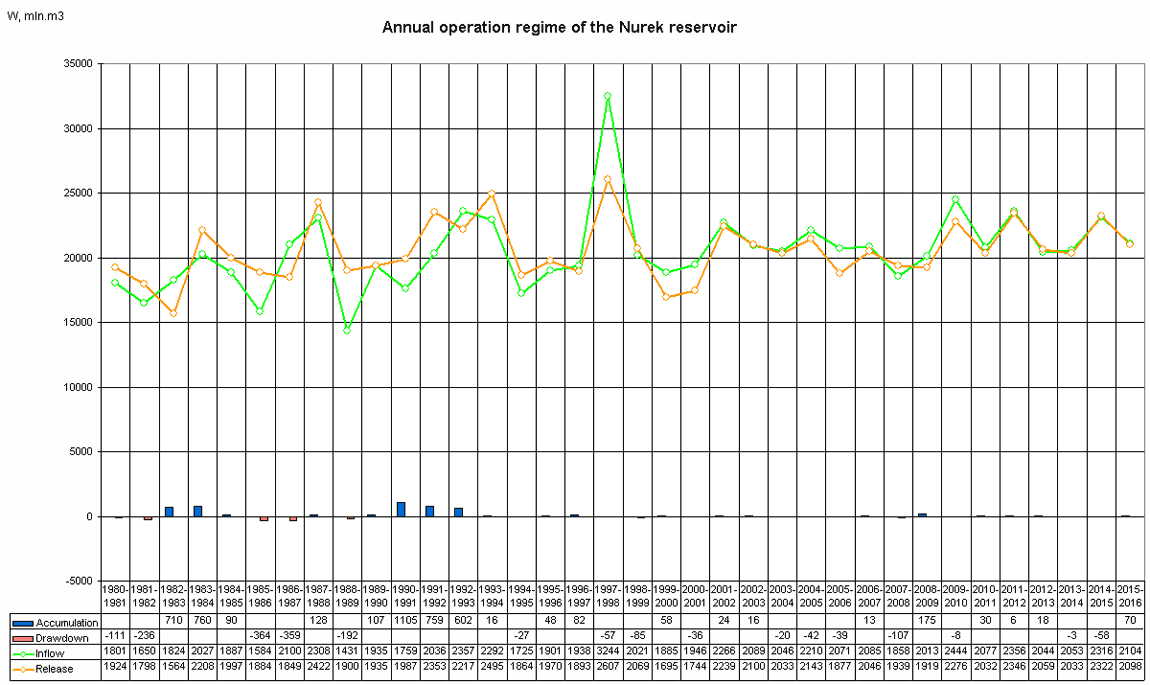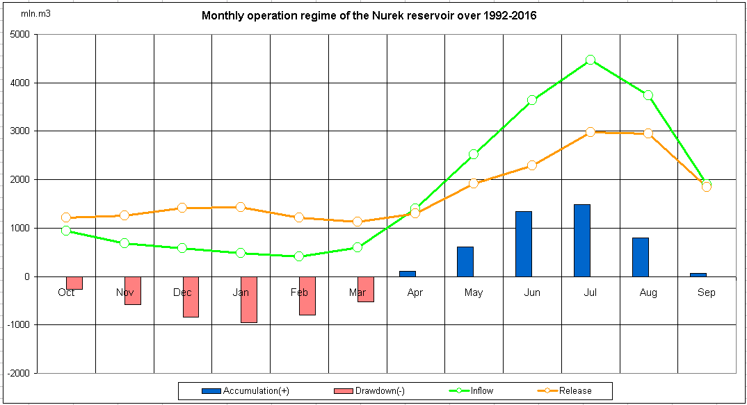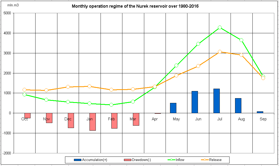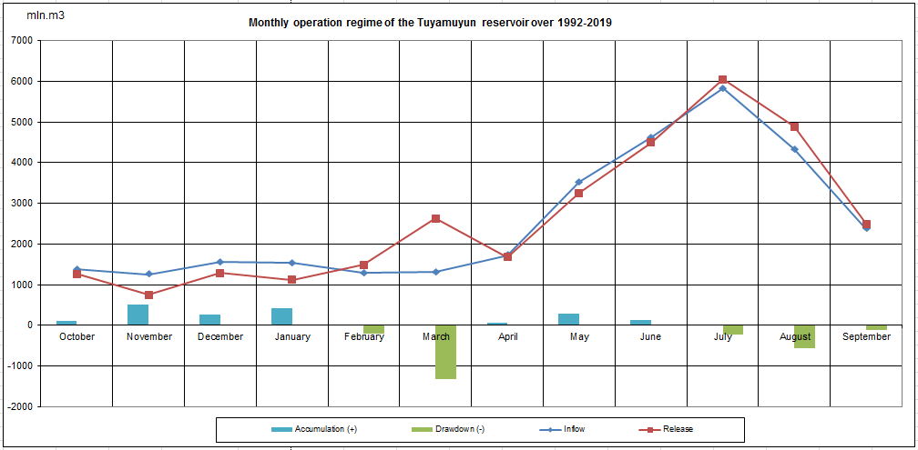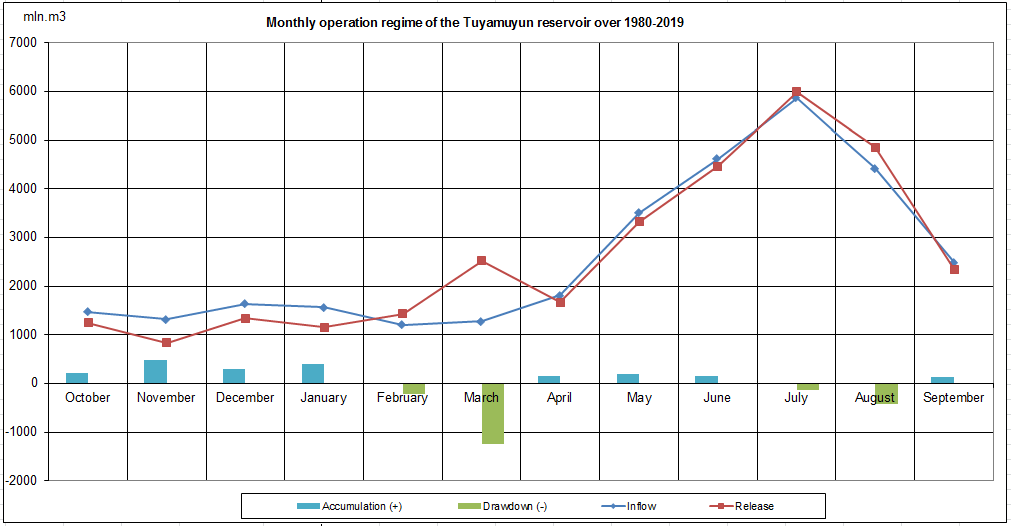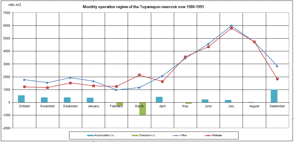 The principle scheme of flow regulation regime along the Amudarya is as following. The Nurek water reservoir provides multi-year water storage for area up to Kerki gauging station. Water releases depend on run-off variations of the Pyandj, Kafirnigan, Surkhandarya and Kunduz rivers, and water demands of downstream area from Kerki. Tuyamuyun reservoir is operating with a seasonal regime. It catches over released water from the Nurek reservoir and some additional flow of the Amudarya. Releases from it start usually in February-March.