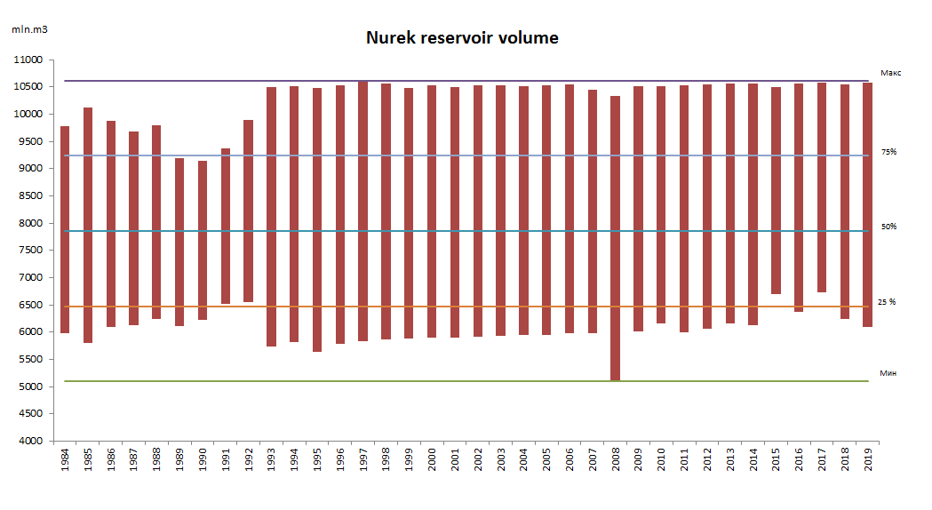 More than 35 reservoirs were constructed in the Amudarya basin with a capacity of over 10 million m3 each. The aggregate capacity of these water reservoirs exceeds 29.8 km3. The Amudarya cascade of reservoirs operates according to specific scheme, allowing regulation by two main river channel reservoirs (Nurek and Tuyamuyun) and several on-system reservoirs on the Karakum, Karshi and Amu-Bukhara canals and small rivers. Total capacity of reservoirs on the main river is about 17 km3.