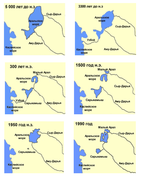 Эволюция периодических колебаний площади зеркала Аральского моря за периоды 10000 до н.э — 1990 г. н.э