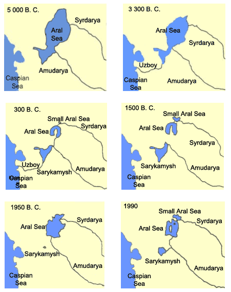 Development of periodic fluctuations in the water area of the Aral Sea over the period from 10000 B.C. to 1990