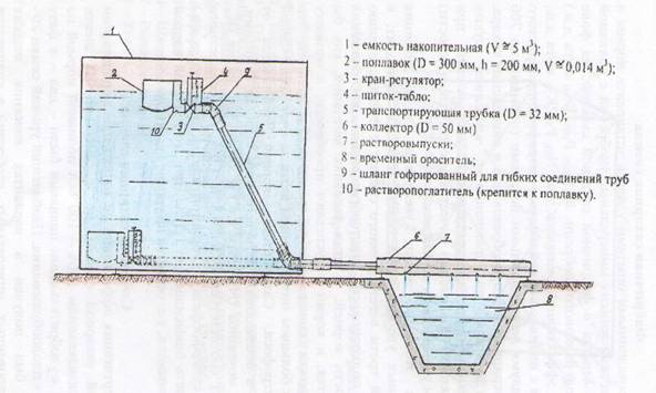 Рис. 1 Схема устройства поплавкового дозатора для внесения жидких минеральных удобрений в поливной поток временного оросителя