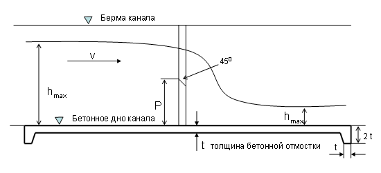 • высота порога водослива «Р» должна быть больше максимальной глубины h max в канале, за водосливом;