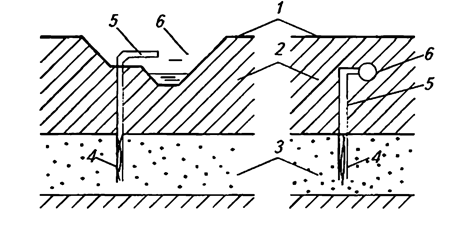 1 – ground surface; 2 – low-permeable stratum; 3 – water-bearing stratum; 4 – screen of well-amplifier;