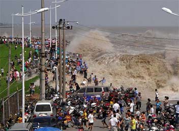 1 сентября 2011 года. Прорыв плотины на реке Цяньтан неподалеку от города Ханчжоу в провинции Чжэцзян на востоке Китая.
