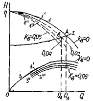 ![]() Рис. 15. Регулирование подачи лопастного насоса впуском воздуха перед рабочим колесом ![]() Рис. 16. Характеристики насоса и сети при регулировании впуском воздуха ![]() Рис. 17. Характеристики насоса и сети при авторегулировании |