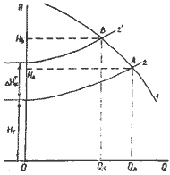 Сброс части поднятого количества воды в нижний бьеф. Сущность данного способа регулирования подачи заключается в том, что по специальному сбросному каналу, соединяющему верхний бьеф с нижним, сбрасывают часть поднятой насосом воды обратно Теряемая при регулировании мощность где Qн - подача насоса Qc - сбрасываемый расход Nн - мощность, потребляемая насосным агрегатом Сброс лишней воды в процессе эксплуатации приводит к перерасходу пресной воды и электроэнергии на ее подъем. В работе [9] предлагается сбрасывать лишнюю воду через один из агрегатов насосной станции. Насосный агрегат при этом переводится в турбинный режим, а рекуперированная электроэнергия подается в питающую сеть. Впуск воздуха во всасывающую трубу насоса. Этот способ аналогичен способу регулирования задвижкой на всасывающей трубе, так как впуск воздуха уменьшает вакуум, а, следовательно, и высоту всасывания. Введенный во всасывающую трубу воздух уменьшает величину подачи воды насосом на величину объема воздуха. Сущность этого способа иллюстрируется на рис. 15, 16. При впуске воздуха происходит смещение вниз характеристики Q-H насоса, поэтому можно подобрать режим работы насоса, соответствующий условиям подачи заданного расхода Qв. При впуске воздуха КПД насосной установки снижается тем больше, чем больше воздуха впускается в насос, т.е. чем больше KB отношение объема воздуха к объему воды. Впуск воздуха при небольших изменениях подачи не менее 0,7 от оптимальной является более выгодным, чем дросселирование. Работа насоса при наличии воздуха в рабочем колесе становится неустойчивой, создается опасность разрыва водяного столба во всасывающей линии и возможность срыва работы насоса Авторегулирование (изменение статической составляющей напора). Напор насоса зависит от разности уровней воды в нижнем и верхнем бьефах. Однако уровень воды в поверхностных источниках не остается постоянным, так как зависит от гидрологического режима источника. Рассмотрим режимы работы насоса при изменениях уровня воды в источнике. На рис. 17 даны характеристики насоса 1 и сети 2 при статическом напоре Нг. Точка А пересечения характеристик насоса и сети соответствует режиму работы системы «насос-сеть» при максимальном уровне воды в источнике. Подача насоса равна QA, напор НА. С понижением уровня воды в источнике увеличивается высота всасывания следует, что Нг есть координата вершины квадратичной параболы при В этом случае режим работы системы «насос-сеть» характеризуется новой режимной точкой В, имеющей координаты Qв, Hв, Nв, |