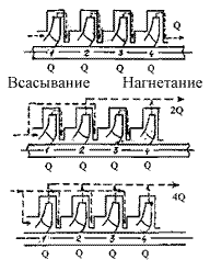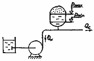 Комбинация включения параллельно/последовательно работающих ступеней в многосекционных насосах. Для регулирования работы насосов специальных конструкций применяют изменение числа работающих ступеней. Этот способ позволяет изменением числа параллельно или последовательно включенных в работу колес ступенчато изменять подачу насоса. В качестве примера на рис. 18 изображена схема многоступенчатого насоса с различным включением ступеней. В первом случае подача насоса равна Q, во втором - 2Q, в третьем - 4Q, где Q подача одной ступени Применение баков-гидроаккумуляторов. При регулировании подачи данным способом рабочие характеристики насоса и сети остаются неизменными. Совместная работа насоса и сети осуществляется вводом в систему промежуточного аккумулирующего устройства d, которое компенсирует несоответствие характеристик (рис. 19) [4]. Для регулирования подачи насоса применяют комбинацию насосов с напорно-регулирующими устройствами, в качестве которых используют: