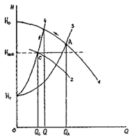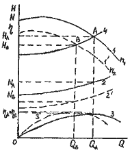 Регулировать асинхронные короткозамкнутые двигатели можно за счет изменения частоты в сети, числа пар полюсов двигателя или скольжения (табл. 2) [1, 8]. КПД электродвигателя зависит от его нагрузки, т.е. отношения рабочей мощности насоса к номинальной мощности двигателя. При регулировании подачи насоса частотой вращения с помощью асинхронного двигателя с фазным ротором необходимо учитывать также потери в регулирующем реостате, определяемые из выражения [22]: где n рабочая частота вращения вала двигателя; nн номинальная частота вращения вала двигателя. При регулировании частоты вращения с помощью тиристорного преобразователя частоты его КПД определяют в зависимости от отношения выходного рабочего напряжения к номинальному [38]: ![]() где u, М, n рабочие значения напряжения, момента и частоты вращения вала насоса; uн, Mн, nн номинальные значения тех же величин. Для регулирования подачи насоса предложен комбинированный способ, сочетающий изменение частоты вращения рабочего колеса насоса с дросселированием [31]. На рис. 26 изображены характеристики насоса 1 и сети 3. Подача насоса, определяемая их пересечением, равна Qa. Пусть требуется изменить подачу насоса до величины Qc и при этом напор должен быть минимально допустимым и в процессе регулирования не снижаться меньше Ндоп. Для этого сначала осуществляют дросселирование трубопровода до расхода, определяемого соотношением ![]() (характеристика сети определяется кривой 4), а затем уменьшают частоту вращения рабочего колеса до значения ![]() где nо исходная частота вращения насоса. При этом рабочая точка переходит в точку С, а характеристика насоса определяется кривой 2. |