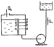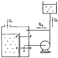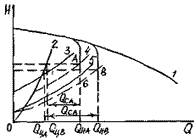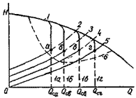 Саморегулирование. Способ саморегулирования расхода основан на изменении Q-H характеристик сети при работе насосов при малом располагаемом кавитационном запасе. Этот способ использует частные кавитационные Q-H характеристики, зависящие от Способ саморегулирования применяют там, где давление жидкости примерно равно давлению насыщенных паров (нагретые жидкости и т.п.). При таком способе регулирования насос постоянно работает в режимах, соответствующим начальным стадиям кавитации. На рис. 35 приведена схема установки при саморегулировании. На рис. 36 изображены нормальная 1 и частные 1а, 16, 1в, 1г характеристики насоса при уровне жидкости в приемном резервуаре соответственно а-а, б-б, в-в, г-г; 2-5 характеристики сети соответственно при тех же уровнях. При возникновении кавитации подача насоса ограничивается из-за частичного парообразования на входе в колесо. Нормальная характеристика насоса 1 в этом случае переходит в одну из частных характеристик, зависящих от располагаемого кавитационного запаса. При этом рабочая точка перемещается в положение а, б, в или г в зависимости от уровня в приемном резервуаре а-а, б-б, в-в, г-г. Подача жидкости насосом во внешнюю сеть при этом составит соответственно Qca, Qcб, Qcв, Осг. Таким образом может осуществляться автоматическое регулирование подачи в зависимости от поступления жидкости в бак. Однако рабочая точка не должна выходить за область, ограниченную кривой 6, иначе может произойти срыв работы насоса. Опыт эксплуатации системы саморегулирования конденсатных насосов на судах показывает, что они могут работать в этом режиме длительный период без повреждений Для обеспечения устойчивой работы насосов при малых по сравнению с номинальной подачах используется способ саморегулирование с перепуском. На рис. 37 приведена схема установки при саморегулировании и перепуске. На рис. 38 изображены характеристики насоса 1 и перепускного трубопровода 2; 3, 5 характеристики наружной сети при уровне жидкости в приемном резервуаре соответственно а-а, б-б; 4, 6 суммарные характеристики сети и перепускного трубопровода соответственно при тех же уровнях. В этом случае насос работает на расходе Qнa или Qнб (в зависимости от уровня в приемном баке), близком к номинальному и обеспечивает подачу в сеть расхода Qca или Qсб. Через байпасную линию циркулирует расход Qца или Qцб |