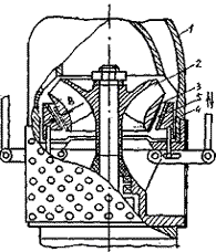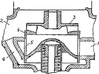 При регулировании насоса данным способом изменение характеристики насоса обеспечивается за счет отвода с напорной стороны насоса из области за рабочим колесом до выправляющего аппарата через кольцевой регулируемый зазор между рабочим колесом и корпусом непосредственно во всасывающую полость. Указанный отвод жидкости в научно-технической литературе рассматривается только как утечка через щелевое уплотнение, которая определяет изменение объемного КПД, причем гидравлический КПД в результате изменения соотношения основного и перепускаемого потока не учитывается. На рис. 46 изображена конструктивная схема центробежного насоса, регулируемого рассматриваемым способом. Насос содержит установленные в корпусе 1 рабочее колесо 2 с ведомым диском 3 и подвижную в осевом направлении втулку 4, снабженную механизмом перемещения и образующую с ведомым диском дросселирующую щель 5 с регулируемым зазором В, сообщающую область 6 выхода из колеса с областью 7 входа в него. Перемещение втулки 4 вызывает изменение зазора Б, соответственно изменяется перетекающий расход, а следовательно и подача насоса. Перепускаемый поток, проходя между корпусом насоса и ведомым диском рабочего колеса, приобретает от последнего закрутку, создавая при этом на входе в рабочее колесо момент скорости, что аналогично действию направляющего аппарата. Уменьшение расхода основного потока снижает потери энергии в выправляющем аппарате (которые составляют 5-10 %), а также во всасывающей и напорной линиях. Закрутка потока перед рабочим колесом обеспечивает снижение энергетических затрат (по сравнению с дросселированием) [32]. Дросселирование с перепуском. Для регулирования подачи центробежных насосов, применяемых в качестве циркуляционных в системах охлаждения, предложена следующая конструкция (рис. 47). Характеристика насоса (1), поясняющая данный способ регулирования, показана на рис. 48. Насос содержит всасывающий 1 и напорный 2 патрубки, рабочее колесо 3, подвижный цилиндр 4 с отверстиями 5, имеющий возможность осевого перемещения. При полной нагрузке (все радиаторы включены) подача насоса равна Qmax. Сокращение нагрузки (постепенное выключение части радиаторов охлаждения) вызовет уменьшение подачи насоса и повышение давления. При этом цилиндр начнет перемещаться в направлении рабочего колеса, частично перекрывая выходное сечение рабочего колеса. Отверстия в цилиндре обеспечивают перепуск потока с напорной стороны насоса на его вход, возрастающий по величине. Перемещение рабочей точки показано линией 2. Серия этих линий (2, 2) приведена для различных возможных режимов работы насоса. Как видно, устройство позволяет поддерживать неизменной величину давления в сети при переменной подаче [33]. |