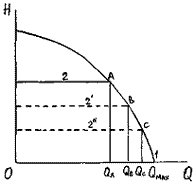 ![]() Рис. 46. Регулирование подачи насоса перепуском по малому контуру с закруткой потока перед рабочим колесом ![]() Рис. 47. Регулирование подачи насоса дросселированием и перепуском ![]() Рис. 48. Характеристики насоса и сети при регулировании дросселированием и перепуском |