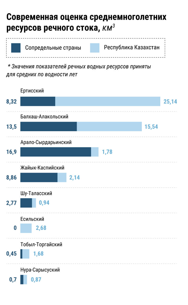 Удельная водообеспеченность оценивается в 37 тыс. куб. м на 1 кв. км и 6,0 тыс. куб. м на одного человека в год. Дефицит водных ресурсов, по данным среднемноголетней водности, достигает 6,6 куб. км и ощущается во всех бассейнах. В засушливые годы уровень водообеспечения снижается до 60 %, а по отдельным регионам (Центральный Казахстан) - до 5-10 %. Причинами дефицита водных ресурсов являются природные условия (90 % стока рек приходится на весенний период) и формирование около половины стока (56,5 куб. км) на территории сопредельных государств, а также экстенсивное их использование, чрезмерное безвозвратное водопотреблениена орошение и потери воды. Кроме того, поверхностные водные ресурсы по территории республики распределены крайне неравномерно и подвержены значительным временным колебаниям.