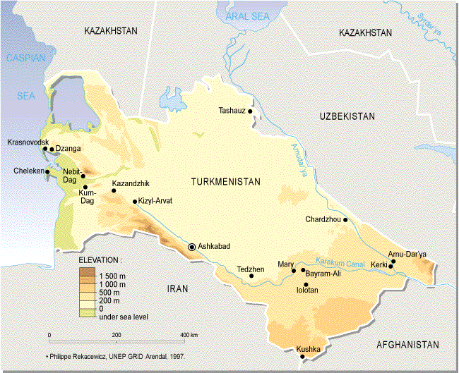 Климат равнинной территории страны - резко-континентальный и исключительно сухой. Среднегодовая температура воздуха колеблется от 11-13°С на севере до 15-18°С на юго-востоке. Самый холодный месяц - январь (средняя температура от -6 до +5°С). Максимального значения температура воздуха достигает в июле (средняя месячная температура 27-30°С). В прибрежных районах самым жарким месяцем бывает август. В Репетеке и Учаджи зарегистрирован абсолютный максимум температуры воздуха +50°С. В среднем за год на территории Туркменистана выпадает от 76 (побережье Карабогазгол) до 30 мм осадков (Копендаг, м.Койне-Кесир). По годовому количеству атмосферных осадков на территории Туркменистана выделяются 4 района: Зангузские Каракумы и залив Карабогазгол с количеством осадков менее 110 мм; низменные Каракумы с суммой осадков до 150 мм; предгорная зона юга и юго-востока - до 200-250 мм и горные районы - более 250 мм. Годовое количество суммарной радиации изменяется по территории в пределах 6000-6800 Мдж/кв.м, что является максимумом для Средней Азии.