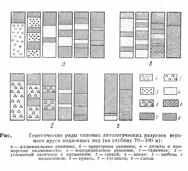 Литологический разрез подгорных равнин, хорошо дренированных и обеспеченных подземным оттоком, представлен толщей мелкоземистых отложений, подстилаемых крупнообломочными грунтами. Для них характерны два генетических ряда разрезов - один связан с аллювием крупных рек и имеет окатанные фракции галечниково-песчаных водоносных слоев, последовательно уменьшающихся от гор к равнине и замыкающиеся глинами и песками. Другой связан с временными потоками, для которых характерны угловатость обломков и наличие мелкозема в крупнообломочном материале, замыкающегося на периферии суглинисто-глинистыми слоями.