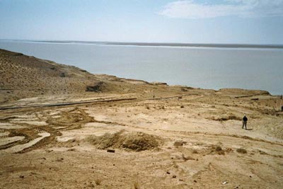 Crumbly rocks of the desert banks do not bear an onset of a rapid of the Amu Darya. The river always changes its river-bed, eroding the right bank most of all and constantly displacing to the east. This natural phenomenou explanes unusual turbidity of the Amu Darya water. It contains on the average 3,6 km of alluviums in a cubi metre, that is more than in the Nile. During high-flood the Amu Darya becomes especially furious and destroying.