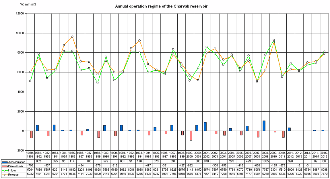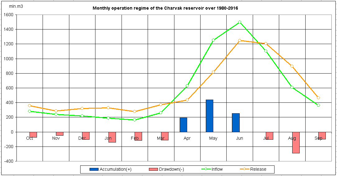 Monthly operation regime of the reservoir over 1980-2016