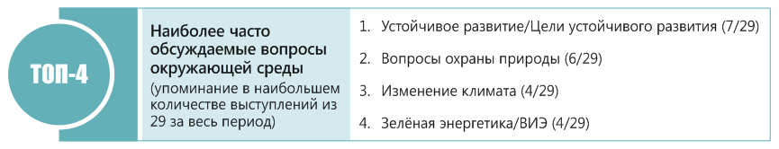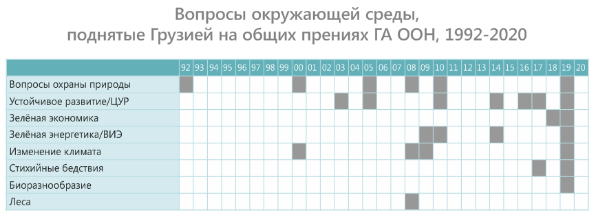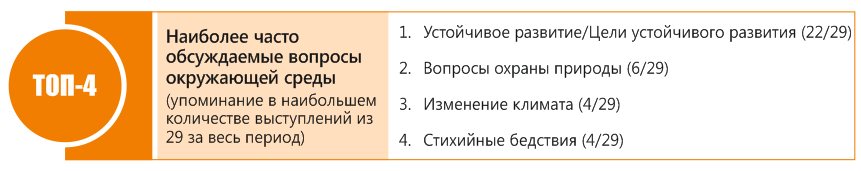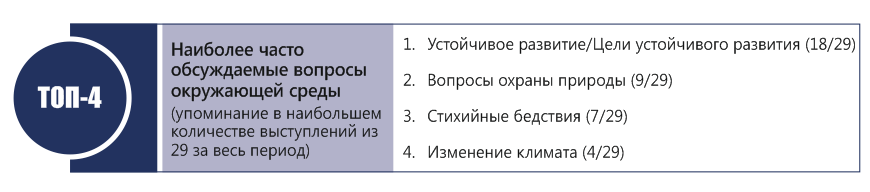 В выступлениях Азербайджана, Армении и Грузии вопросы окружающей среды не были приоритетными, но, тем не менее, в отдельные годы поднимались вопросы устойчивого развития и целей развития, общие вопросы охраны окружающей среды, изменения климата и стихийные бедствия.