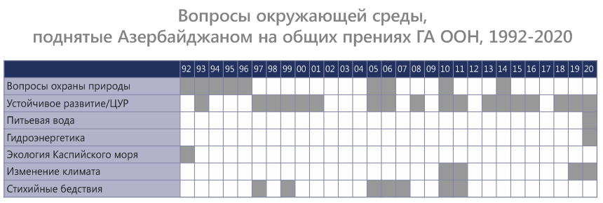 Проблемы отдельных водных экосистем поднимались только Азербайджаном. О «трагически тяжелом состоянии Каспийского моря», намерениях принять все меры для спасения «уникального природного организма» Азербайджан упомянул в первом выступлении на ГА ООН, выражая также надежду на помощь мирового сообщества (74/1992). Во всех последующих выступлениях о Каспийском море говорится только в контексте развития транспортной инфраструктуры, разработки и эксплуатации углеводородных ресурсов. Звучит призыв воздержаться от применения силы и угрозы силой: «Свободная эксплуатация природных ресурсов и их транспортировка на мировые рынки — это неотъемлемое право суверенного государства. Каспийское море должно стать морем мира и сотрудничества» (56/2001).