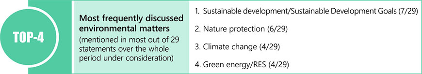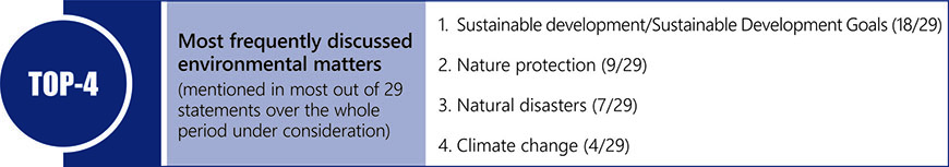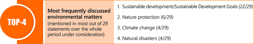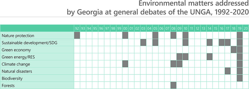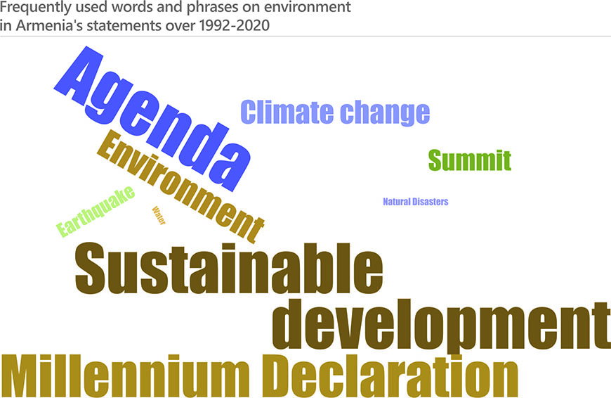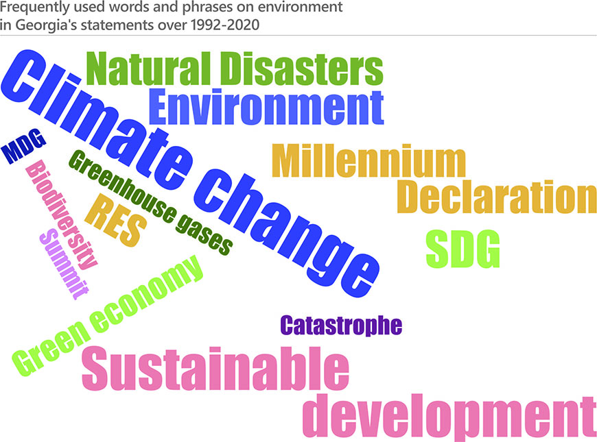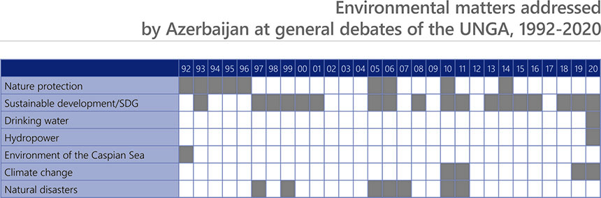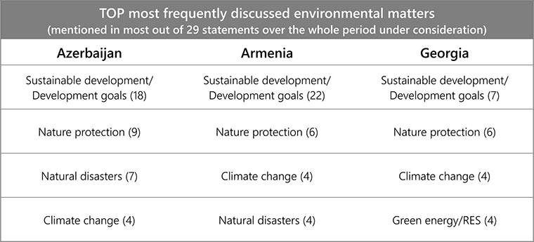 The environmental matters have not been among priorities in the statements of Azerbaijan, Armenia and Georgia. In some years, however, the countries addressed matters related to sustainable development, development goals, the environmental conservation, climate change and natural disasters.
