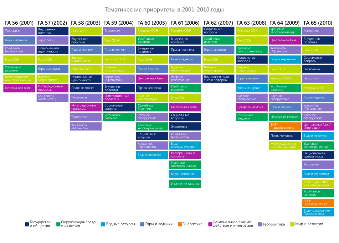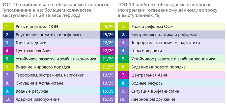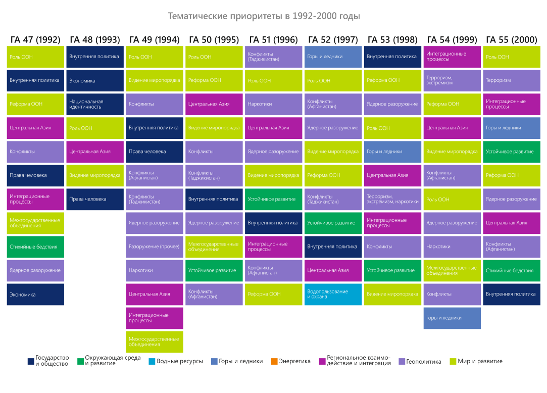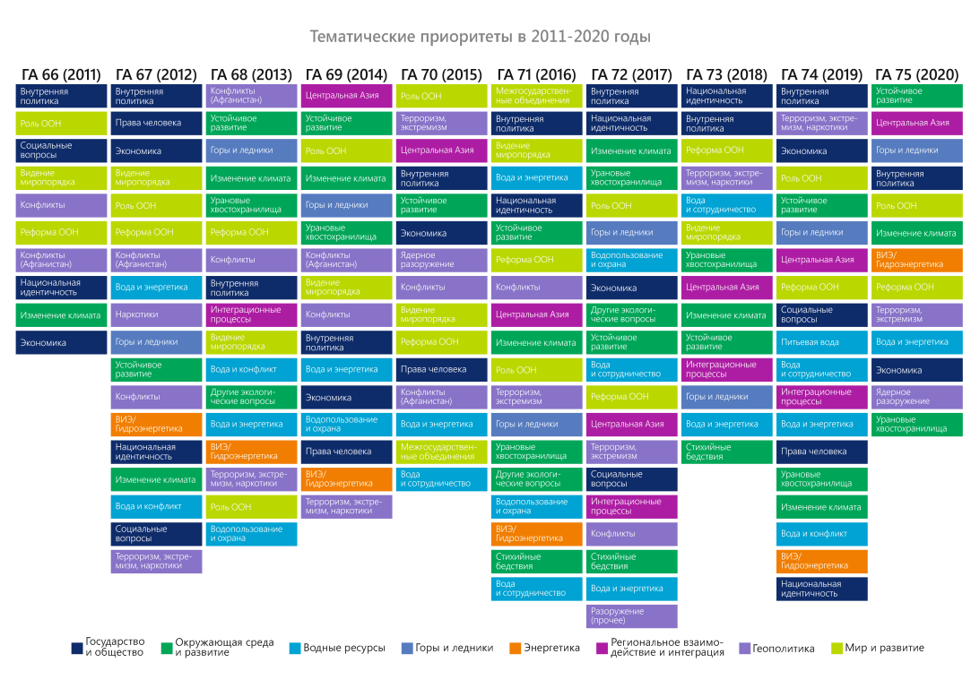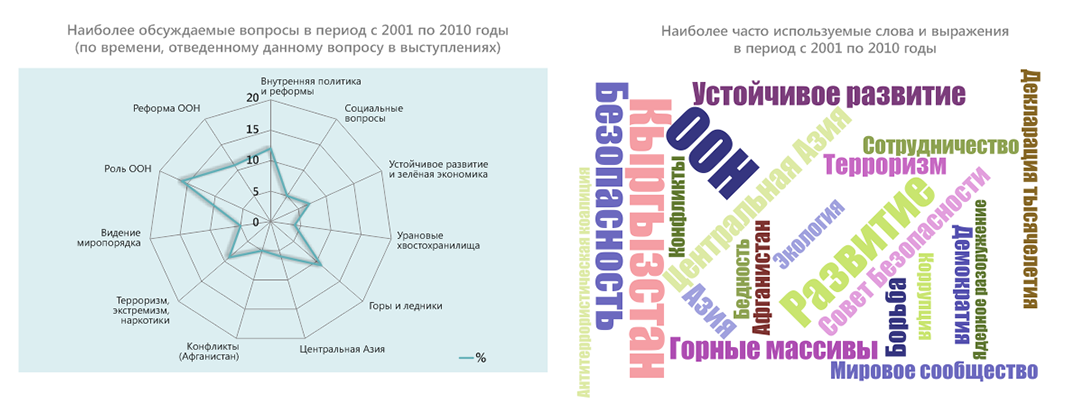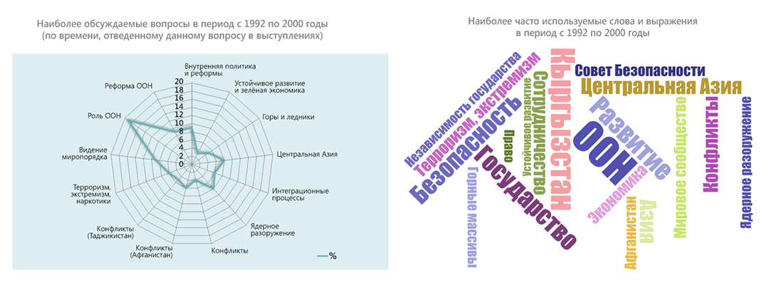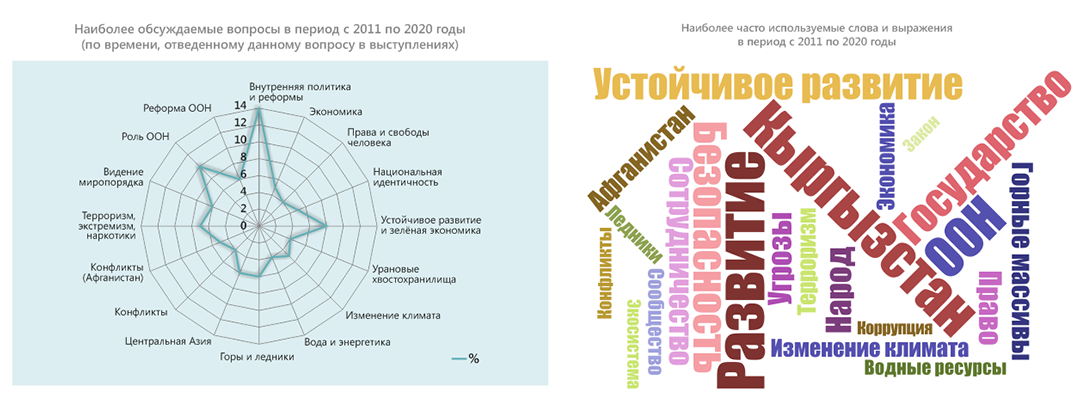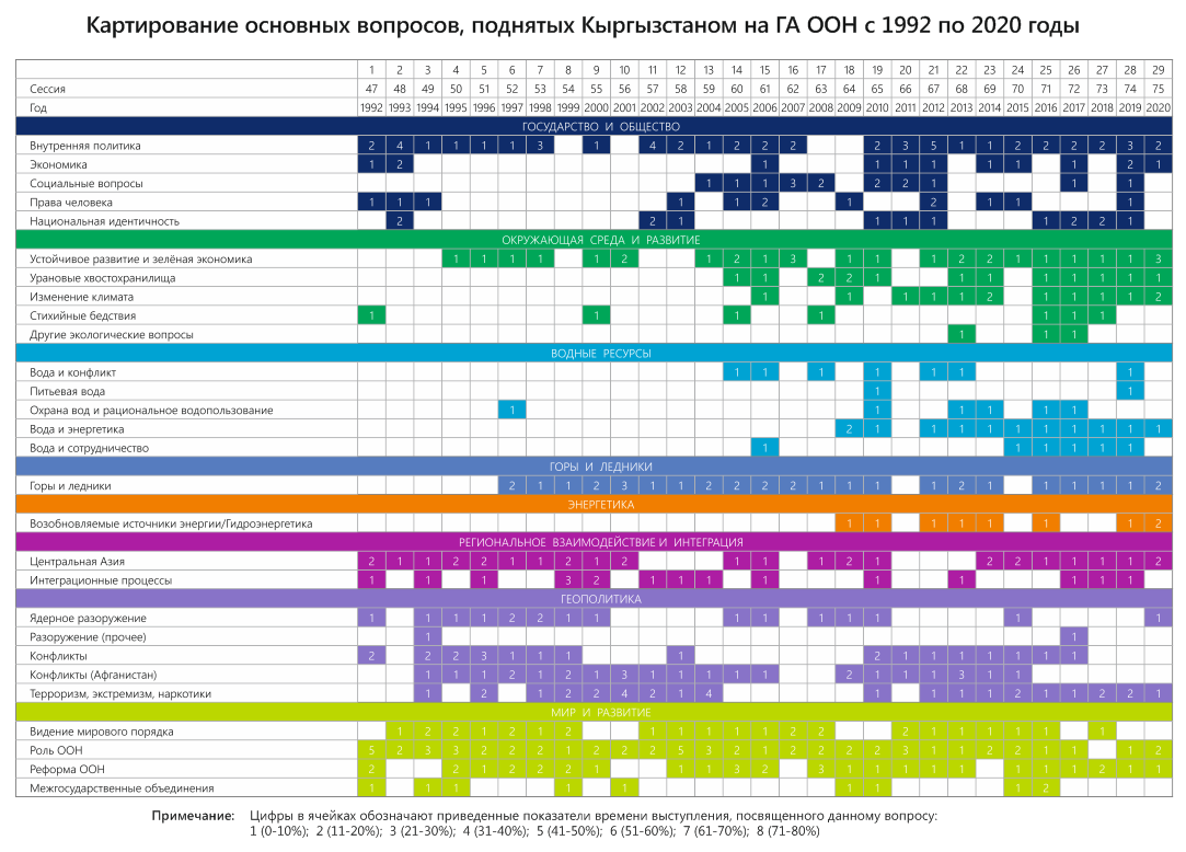 В конце 2020 г. – начале 2021 г. в честь 75-летия ООН члены экспертной платформы провели оценку выступлений стран Центральной Азии на общих прениях Генеральной Ассамблеи ООН в период с 1992 по 2020 гг. Цель исследования – выяснить, на какие вопросы страны обращали внимание c главной мировой трибуны, какие инициативы настойчиво продвигали. Ниже представлены краткие результаты обзора выступлений Кыргызской Республики.