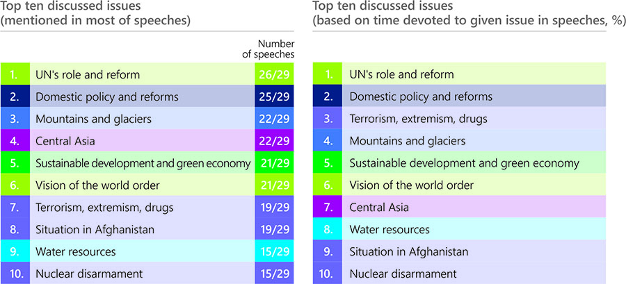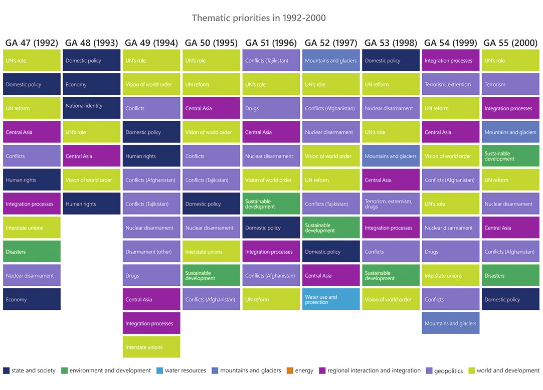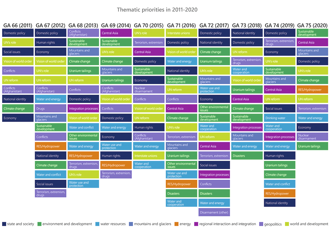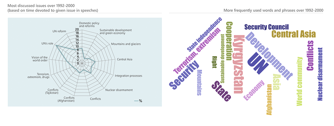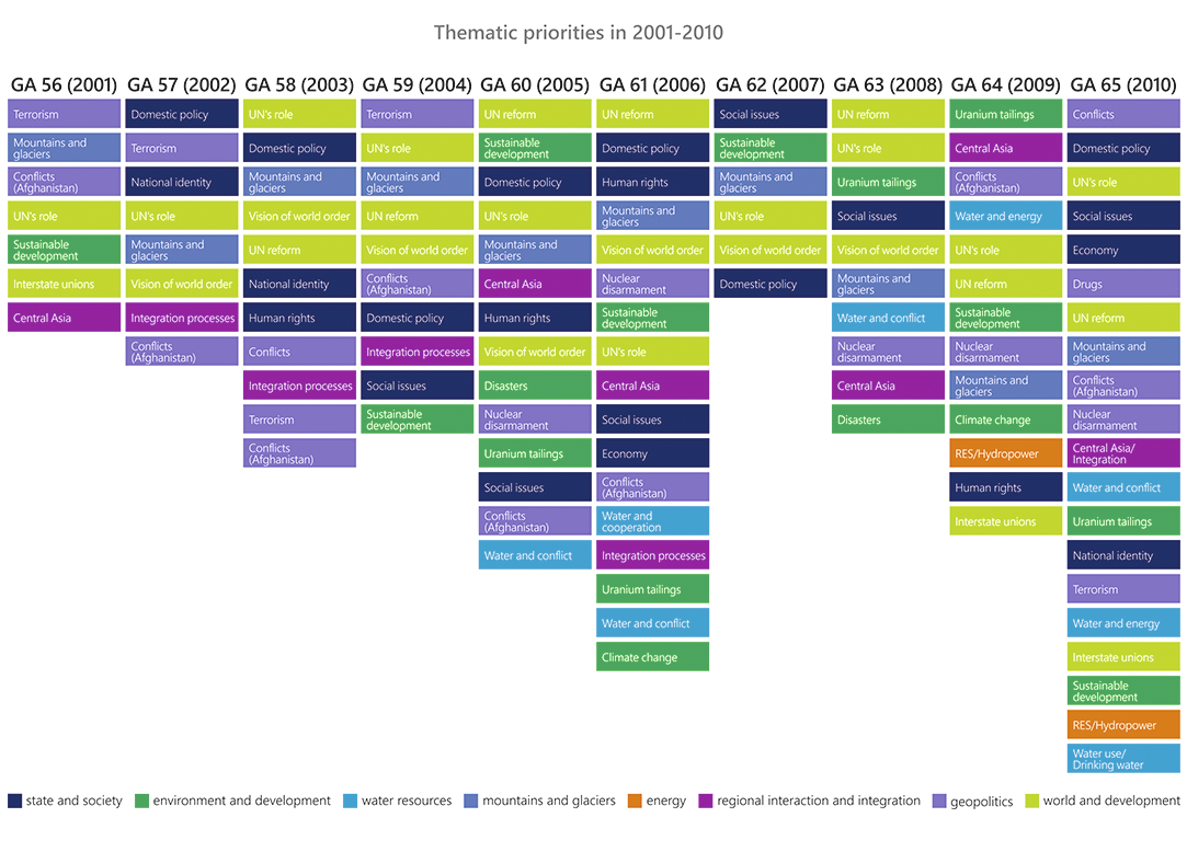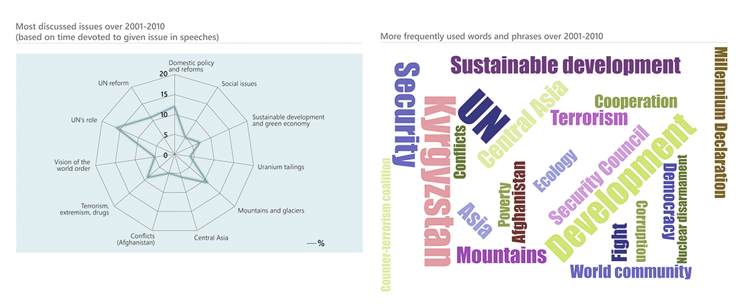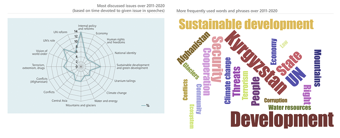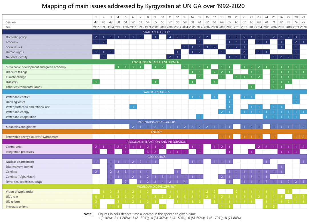 “One of mottos of the Kyrgyzstan’s foreign policy is that small countries must have big friends.” The UN is among such a trusted friend for Kyrgyzstan (59/2004). Thus, greater attention in Kyrgyzstan’s speeches during the UNGA general debates was paid to UN’s role and reform. Among the most frequently addressed issues also were domestic policy and reforms, with the focus on democracy, rule of law, anti-corruption, and gender equality.