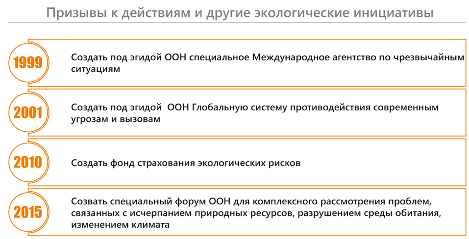 Среди выдвинутых Российской Федерацией инициатив – создание под эгидой ООН специального Международного агентства по чрезвычайным ситуациям, которая реализована с 2006 года в виде Центрального фонда реагирования на чрезвычайные ситуации; создание глобальной системы противодействия современным угрозам и вызовам; и учреждение фонда страхования экологических рисков.