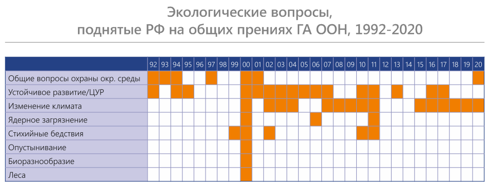Российская Федерация регулярно поднимала с трибуны Генассамблеи ООН проблемы охраны окружающей среды и устойчивого развития. Среди наиболее обсуждаемых тем – вопросы, связанные с устойчивым развитием, изменением климата, охраной окружающей среды, угрозами стихийных бедствий и техногенных катастроф. Проблемы опустынивания, биоразнообразия и лесов упоминались по одному разу в контексте необходимости наращивания международного сотрудничества в рамках ООН. Вопросы ядерного загрязнения поднимались в связи с необходимостью решения проблемы радиоактивных отходов и исключения использования обогащенного урана и чистого плутония (2000), а также с ситуацией вокруг аварии на АЭС «Фокусима-1» в Японии (2011). Вне освещения выступлений России с трибуны ГА ООН остались вопросы использования и охраны вод (проблемы Байкала, Каспийского моря), трансграничного сотрудничества, загрязнения воздуха и развития зеленой энергетики.