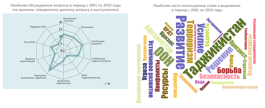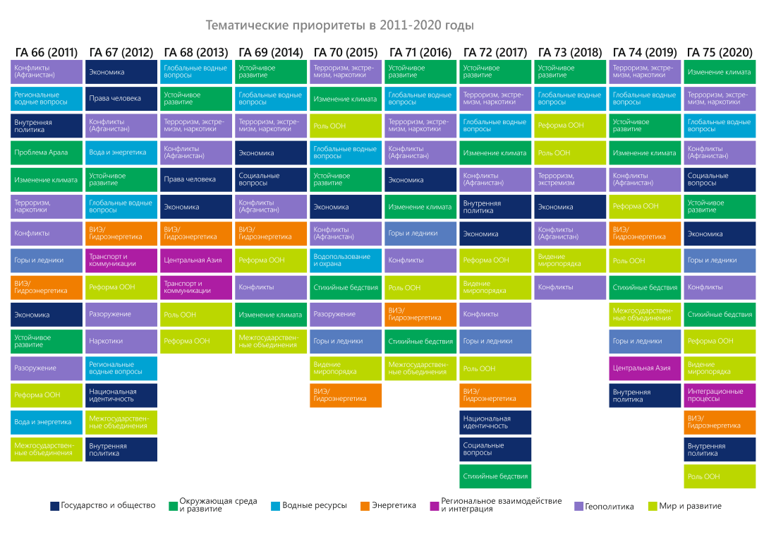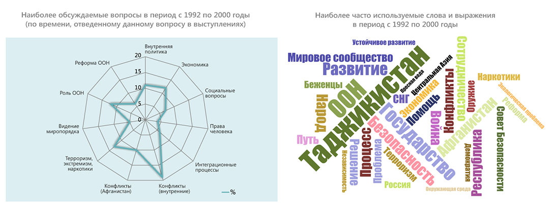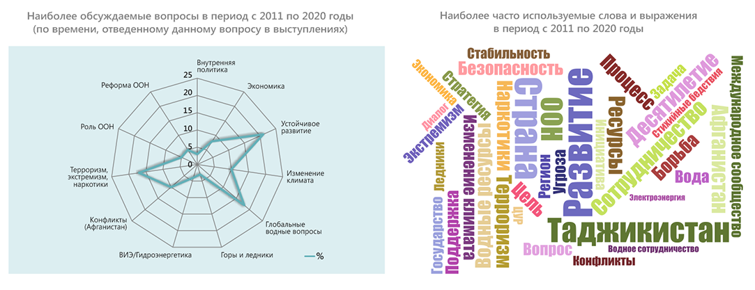 В конце 2020 г. – начале 2021 г. в честь 75-летия ООН члены экспертной платформы провели оценку выступлений стран Центральной Азии на общих прениях Генеральной Ассамблеи ООН в период с 1992 по 2020 гг. Цель исследования – выяснить, на какие вопросы страны обращали внимание c главной мировой трибуны, какие инициативы настойчиво продвигали. Ниже представлены краткие результаты обзора выступлений Таджикистана.