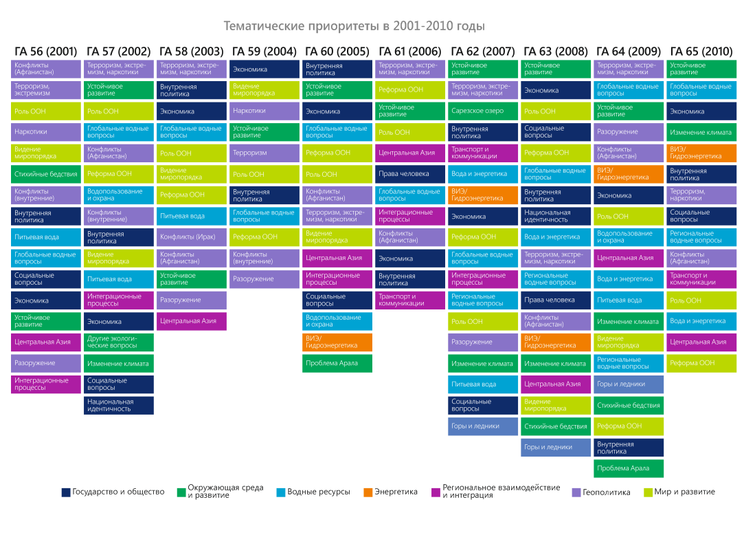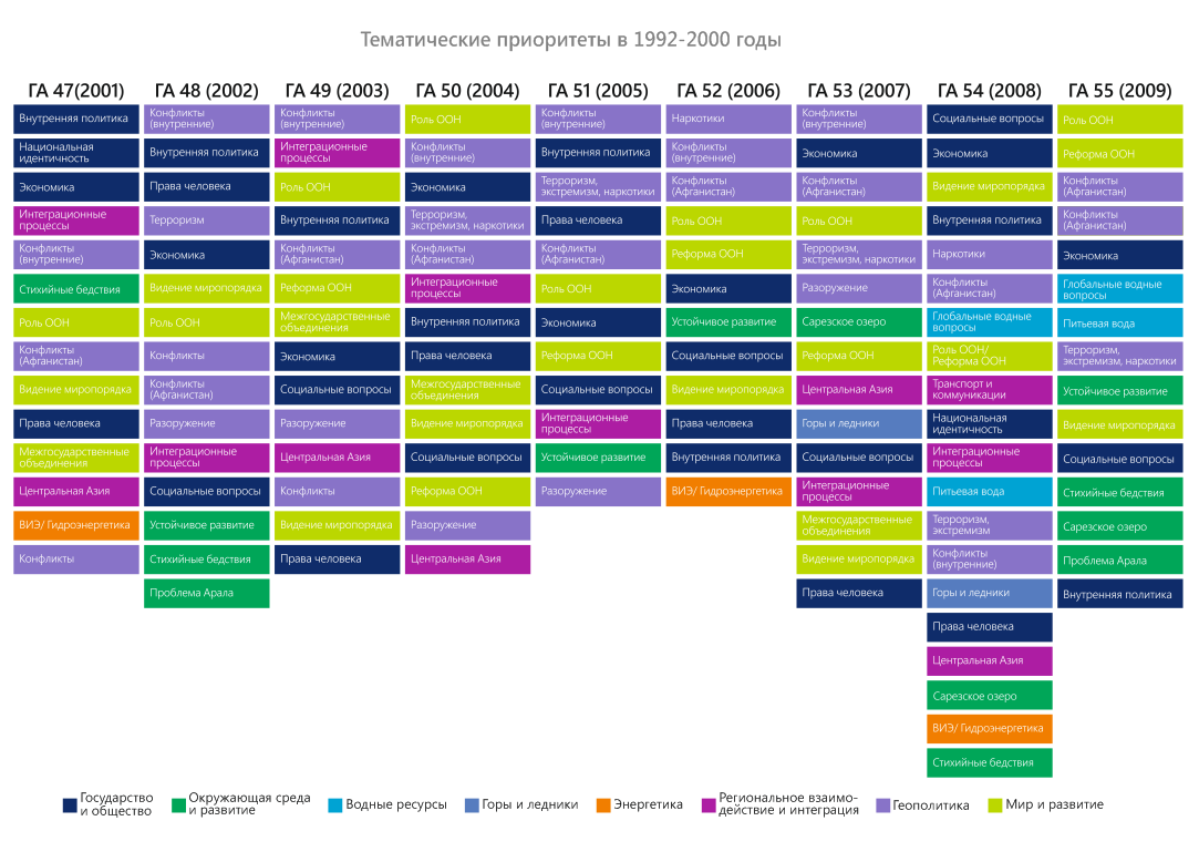 С момента обретения независимости Таджикистан активно продвигал свои приоритеты развития и международного сотрудничества с трибуны ООН. На постоянной основе Таджикистан говорил о стабилизирующей и консолидирующей роли ООН и необходимости проведения ее комплексной и всеохватывающей реформы, поднимал проблемы терроризма, экстремизма и незаконного оборота наркотиков. В числе приоритетных были вопросы политических, социально-экономических и демократических преобразований, происходящих в стране, стабилизация обстановки в связи с межтаджикским конфликтом (1992-2000), урегулирование ситуации в Афганистане. Десятку наиболее часто обсуждаемых тем замыкают вопросы устойчивого развития, зеленой экономики, продвижение глобальных водных инициатив (с 1999 года), расширение глобального партнерства и регионального сотрудничества.