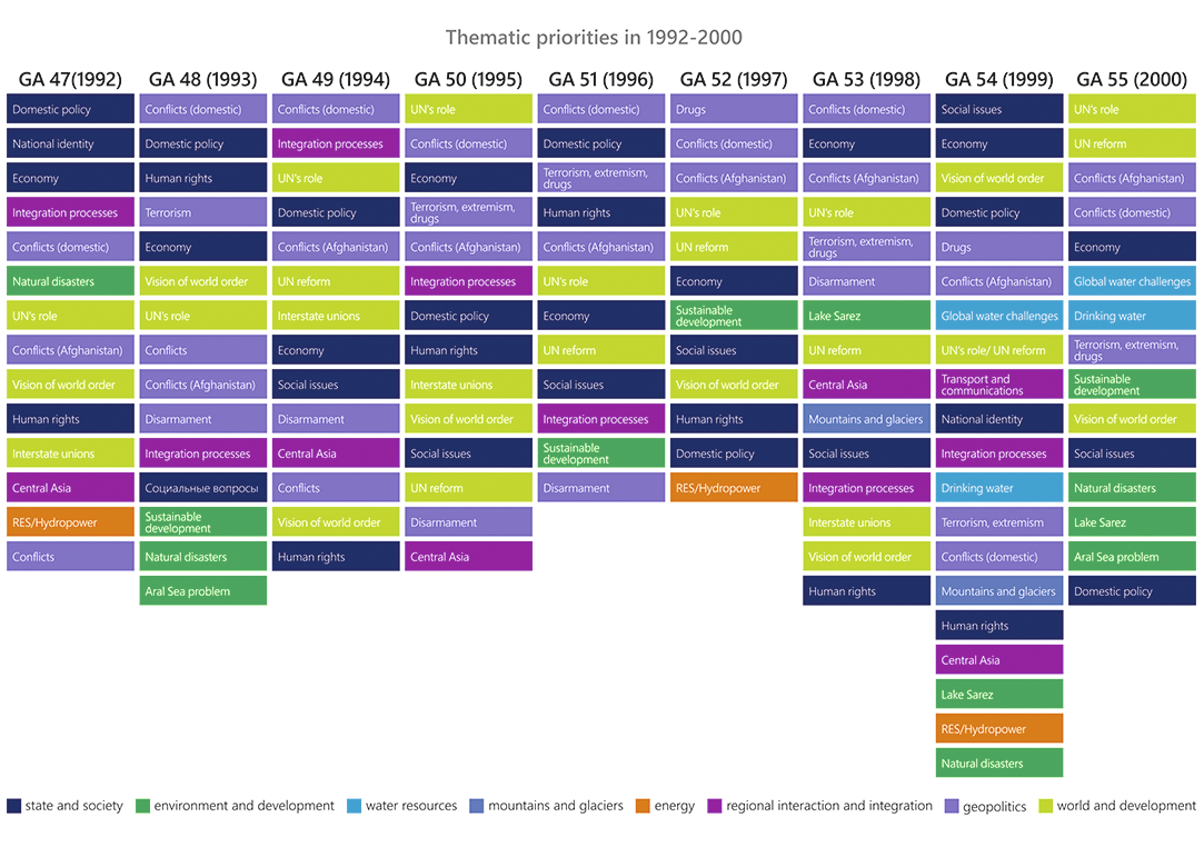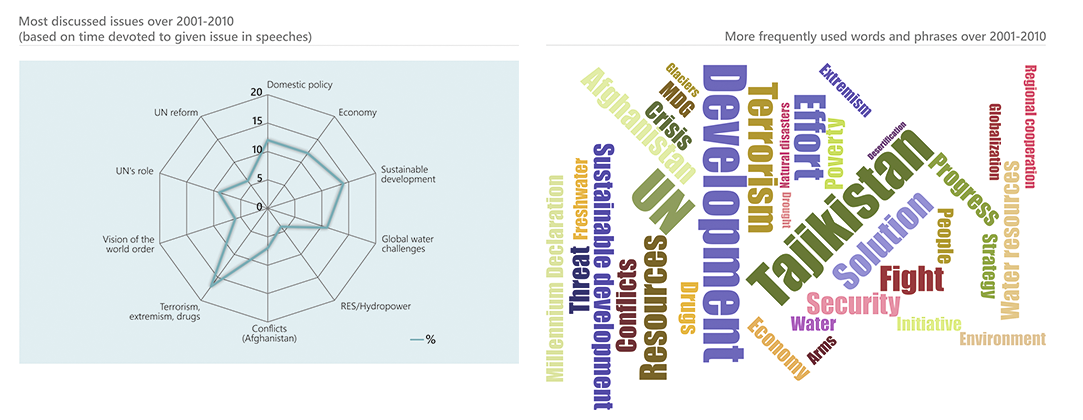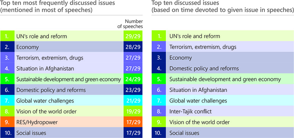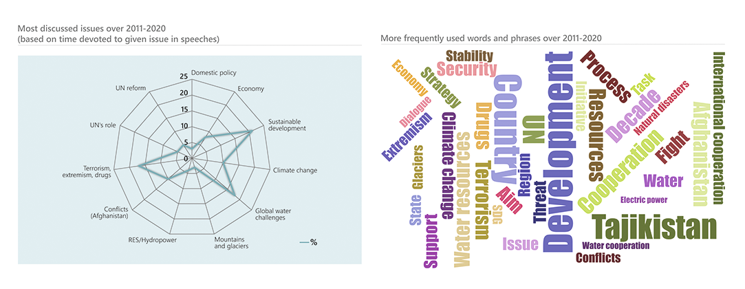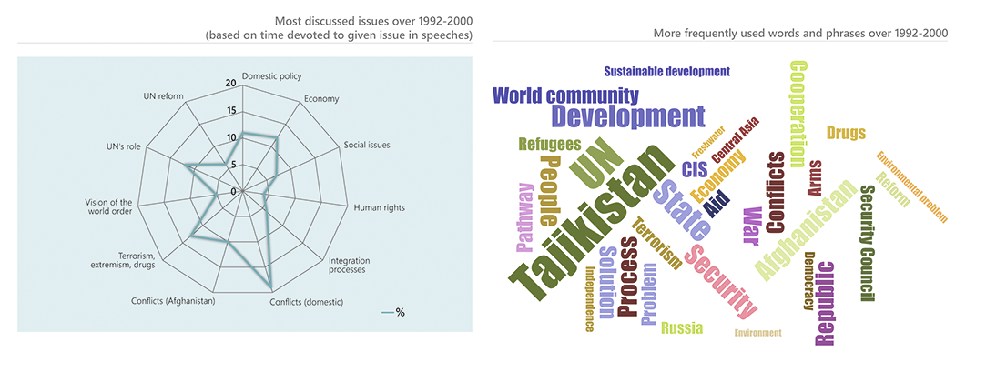 Since independence, Tajikistan has actively advanced its development and international cooperation priorities from the UN rostrum. Tajikistan regularly spoke on the stabilizing and consolidating role of the United Nations and a need for comprehensive and overall reformation of the UN, addressed the issues of terrorism, extremism and drug trafficking. Among the priority issues were political, socio-economic and democratic transformations in the country, stabilization of the inter-Tajik conflict (1992-2000), and resolving the situation in Afghanistan. Sustainable development, green economy, promotion of global water initiatives (since 1999), and enhancement of global partnership and regional cooperation round out the top ten frequently discussed matters.