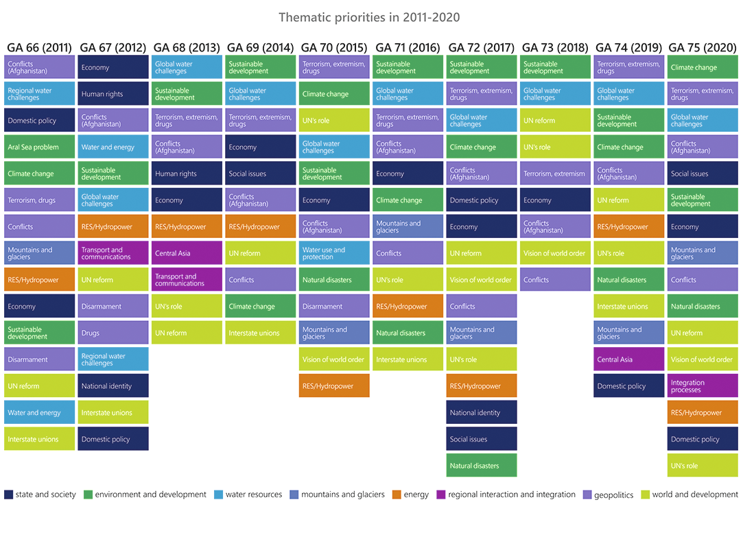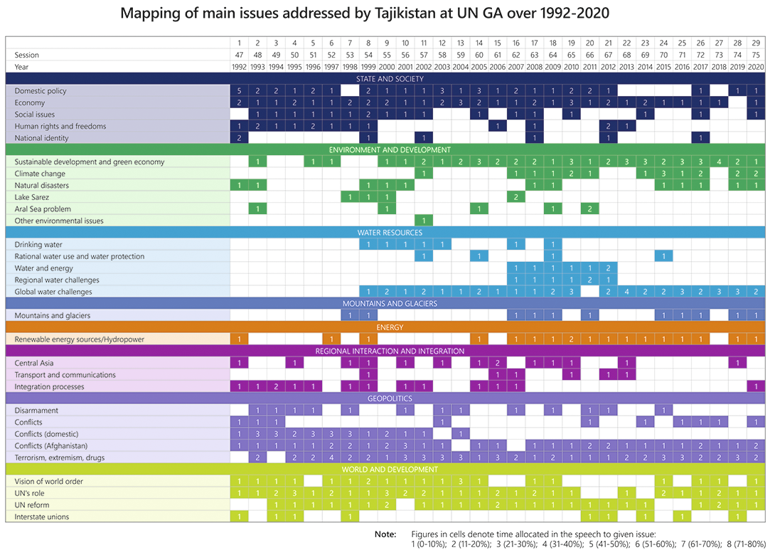 In late 2020 - early 2021, on the occasion of the UN 75th anniversary, members of the Expert Platform made a review of speeches of Central Asian countries at general debates of the UN General Assembly over the period from 1992 to 2020. The objective of this study is to identify what issues the countries have addressed from the main world tribune and what initiatives they have pushed forward. A summary of Tajikistan's speeches review is given below.