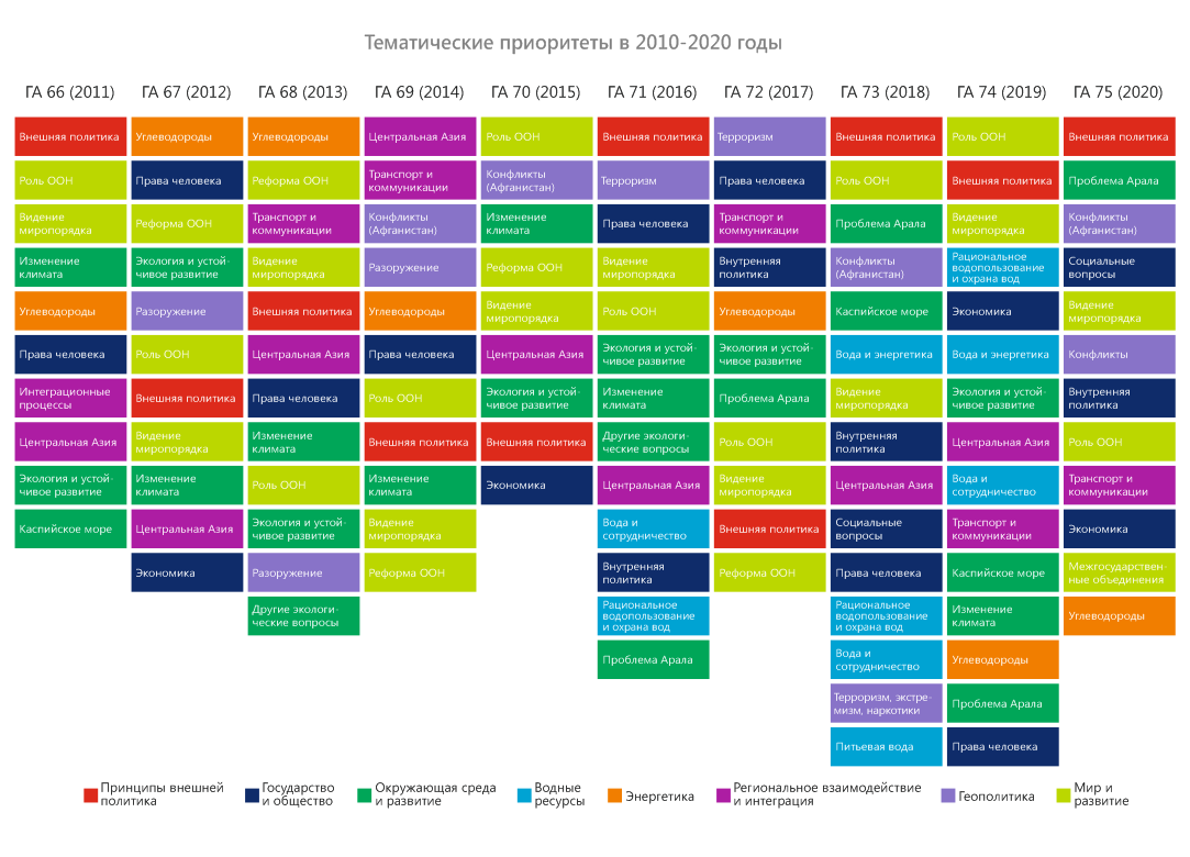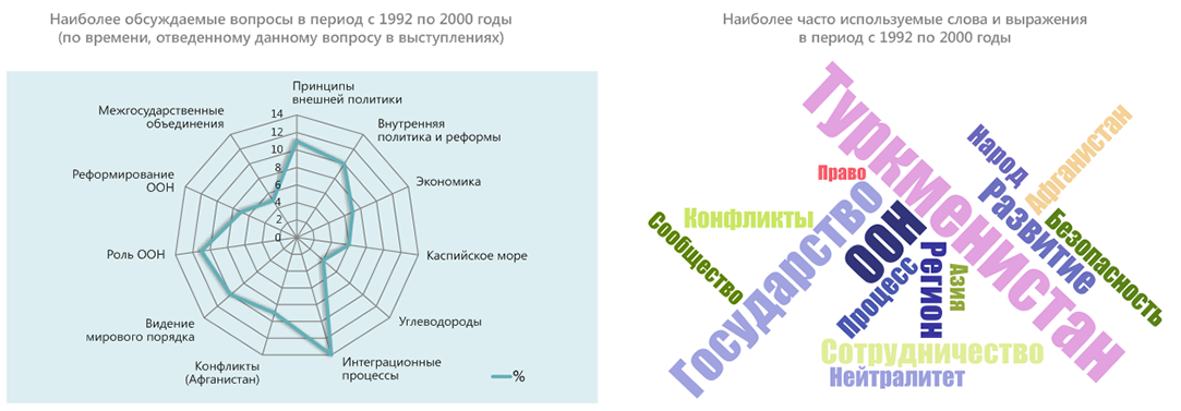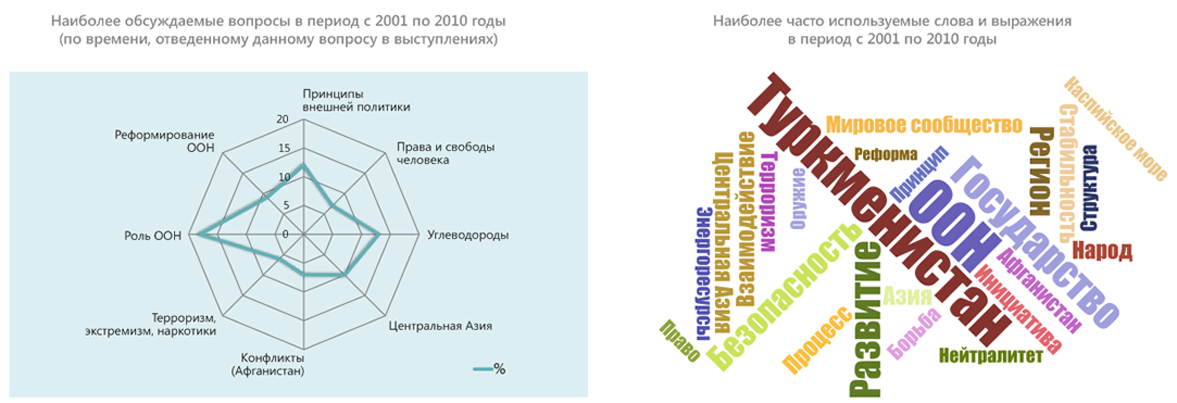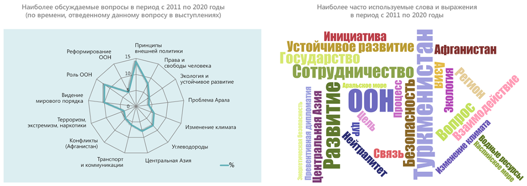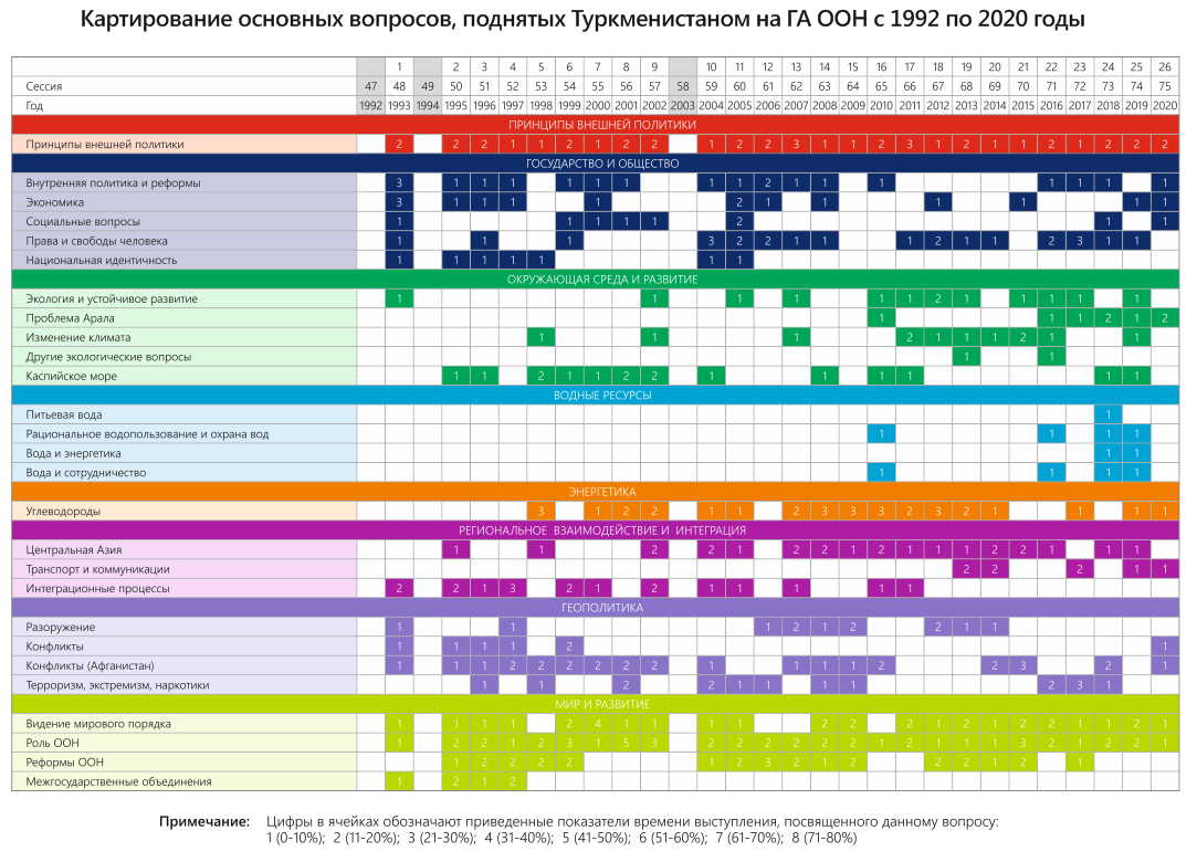 В конце 2020 г. – начале 2021 г. в честь 75-летия ООН члены экспертной платформы провели оценку выступлений стран Центральной Азии на общих прениях Генеральной Ассамблеи ООН в период с 1992 по 2020 гг. Цель исследования – выяснить, на какие вопросы страны обращали внимание c главной мировой трибуны, какие инициативы настойчиво продвигали. Ниже представлены краткие результаты обзора выступлений Туркменистана.