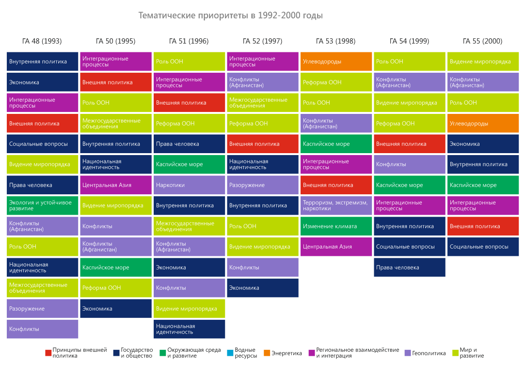 Ключевые инициативы, предложенные Туркменистаном на ГА ООН, демонстрируют практическое воплощение основного принципа внешней политики страны – постоянного позитивного нейтралитета и приверженность приоритетному использованию политико-дипломатических средств при решении международных вопросов. С особой настойчивостью Туркменистан продвигал инициативы по созданию международно-правовых механизмов, направленных на обеспечение интересов производителей энергосырья, транзитных стран и потребителей, а также по развитию транспортных и транзитных коридоров.