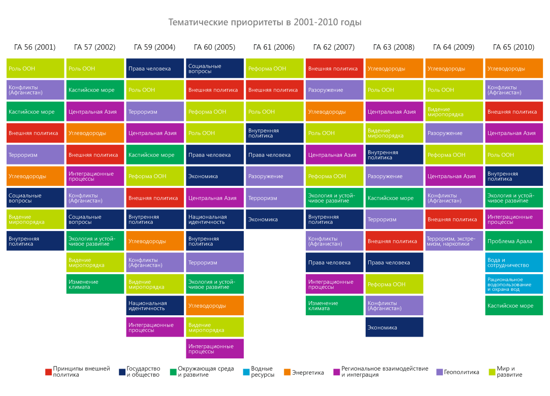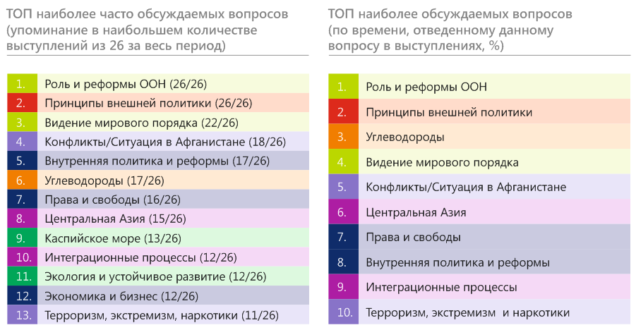 Среди наиболее обсуждаемых вопросов – нейтралитет Туркменистана, основополагающая роль ООН в решении вопросов глобального развития и безопасности и необходимость ее реформирования, а также видение Туркменистана по строительству нового мирового порядка. Следующий блок приоритетных вопросов связан с политическими, экономическими и демократическими преобразованиями в стране. Десятку важных замыкают вопросы регионального взаимодействия в Центральной Азии, проблемы Каспийского моря и рациональное использование прибрежными странами его огромных богатств, экология и устойчивое развитие. Особую обеспокоенность Туркменистана вызывали региональные угрозы, среди которых терроризм, наркотрафик, ситуация в Афганистане, экологическая проблематика и управление водными и энергетическими ресурсами.