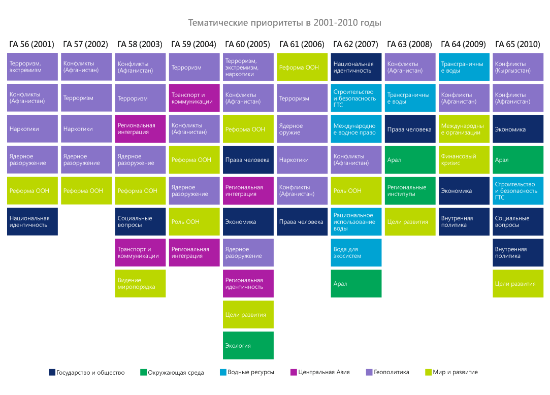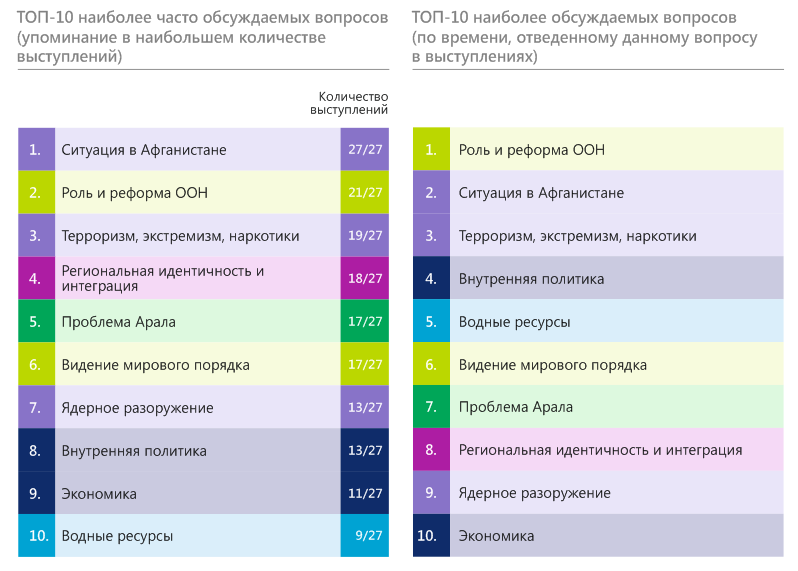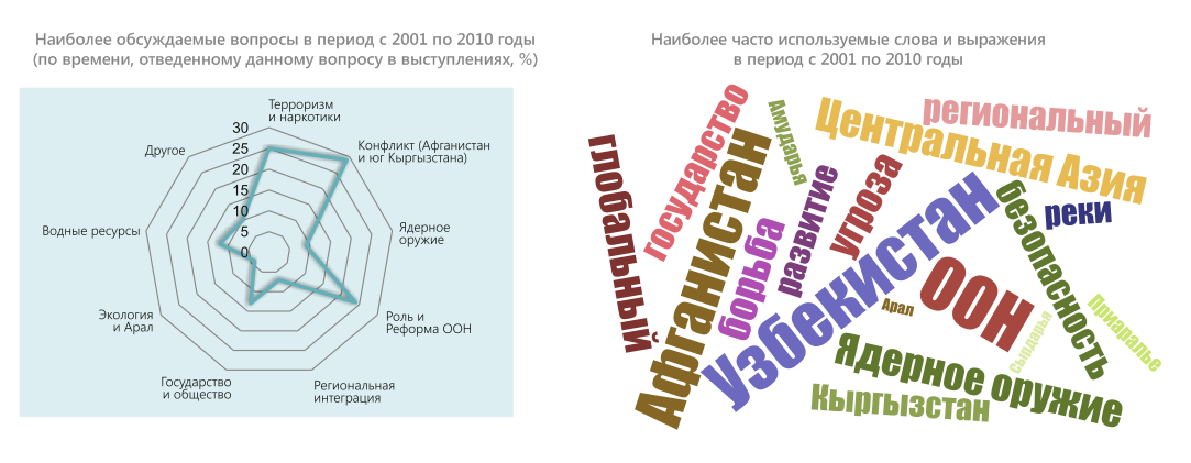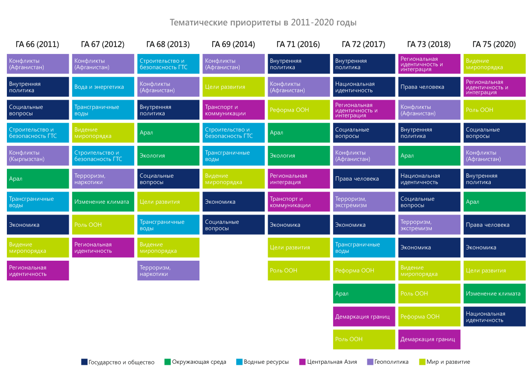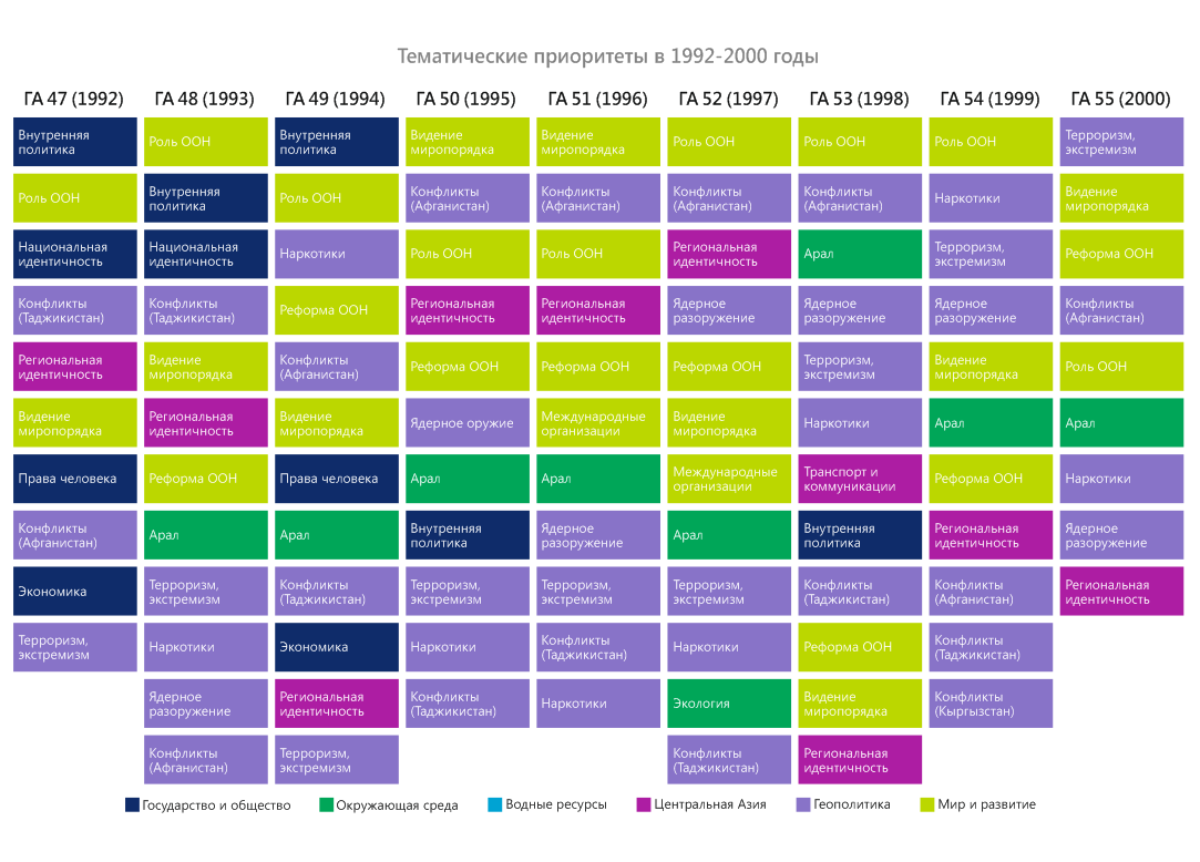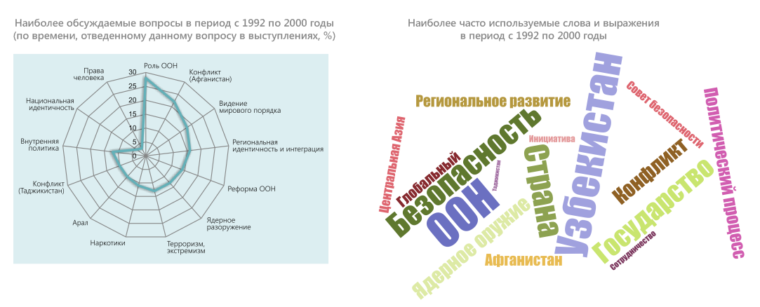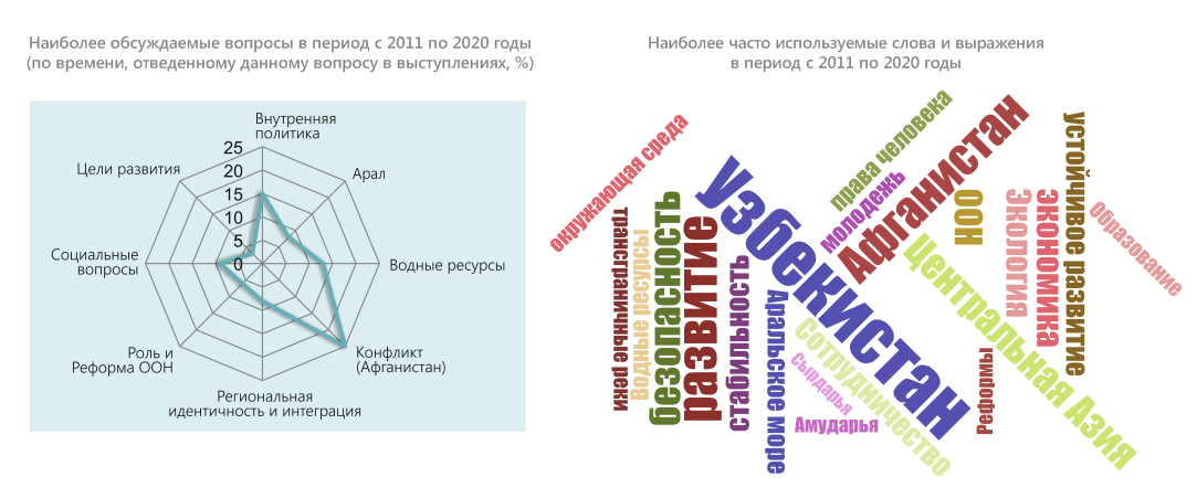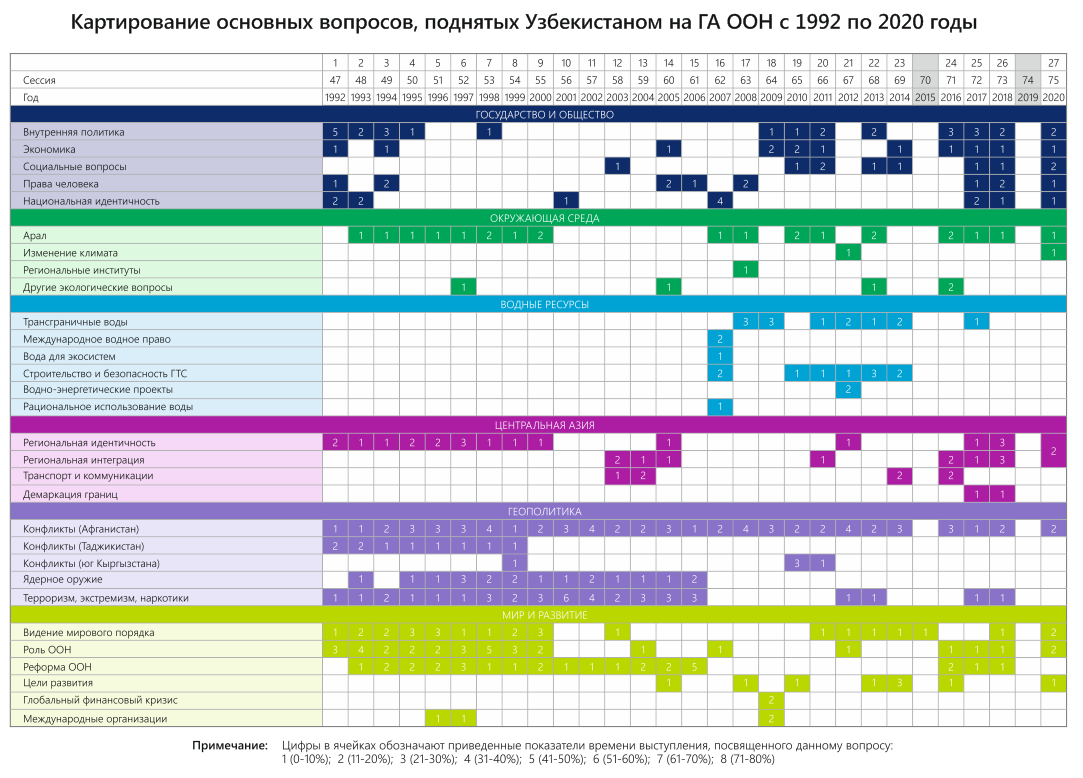 В конце 2020 г. – начале 2021 г. в честь 75-летия ООН члены экспертной платформы провели оценку выступлений стран Центральной Азии на общих прениях Генеральной Ассамблеи ООН в период с 1992 по 2020 гг. Цель исследования – выяснить, на какие вопросы страны обращали внимание c главной мировой трибуны, какие инициативы настойчиво продвигали. Ниже представлены краткие результаты обзора выступлений Узбекистана.